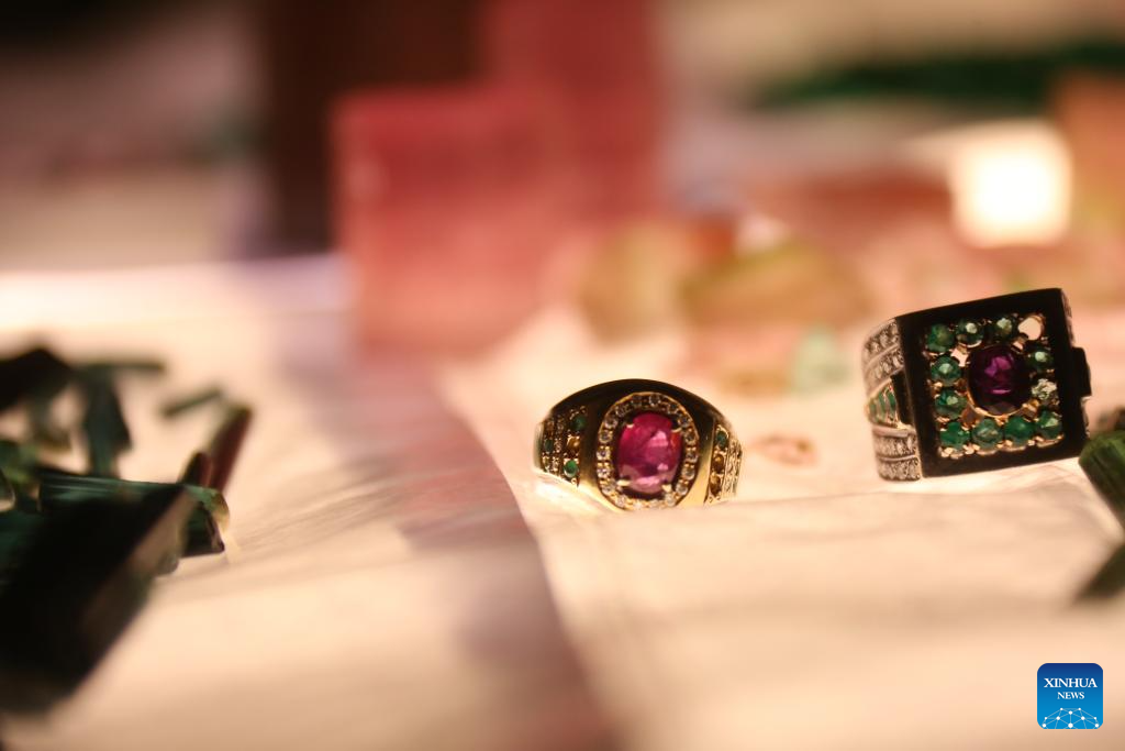 PANJSHIR, 11 julio, 2024 (Xinhua) -- Imagen del 10 de julio de 2024 de piezas de joyería vistas durante una feria de esmeraldas y sus productos, llevada a cabo en la provincia de Panjshir, Afganistán. Una feria de esmeraldas y sus productos fue inaugurada el miércoles en la provincia de Panjshir, Afganistán, con el objetivo de promover la inversión en el sector minero, dijo el portavoz del Ministerio de Minas y Petróleo, Hamayon Afghan. (Xinhua/Saifurahman Safi)