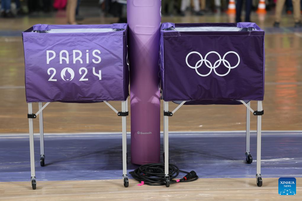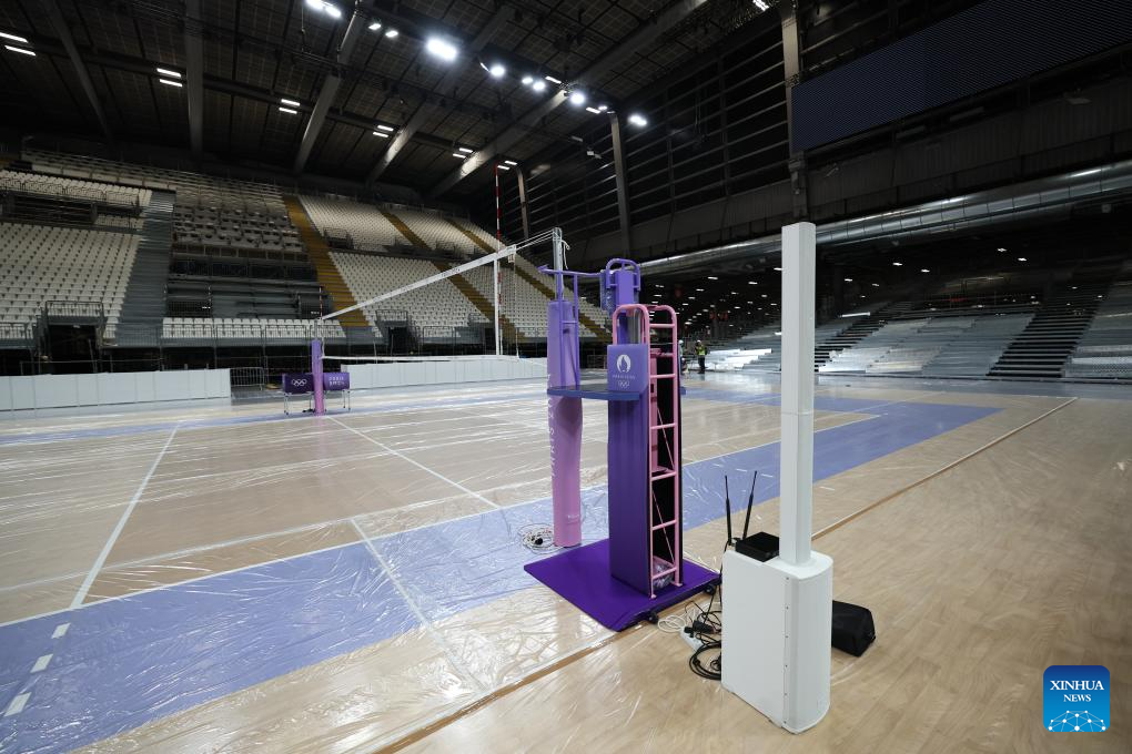 PARIS, 11 julio, 2024 (Xinhua) -- Imagen del 11 de julio de 2024 de las instalaciones de voleibol en la París Sur Arena, en París, Francia. La París Sur Arena albergará eventos deportivos como halterofilia, balonmano, tenis de mesa y voleibol durante los Juegos Olímpicos de París 2024. (Xinhua/Julien Mattia)