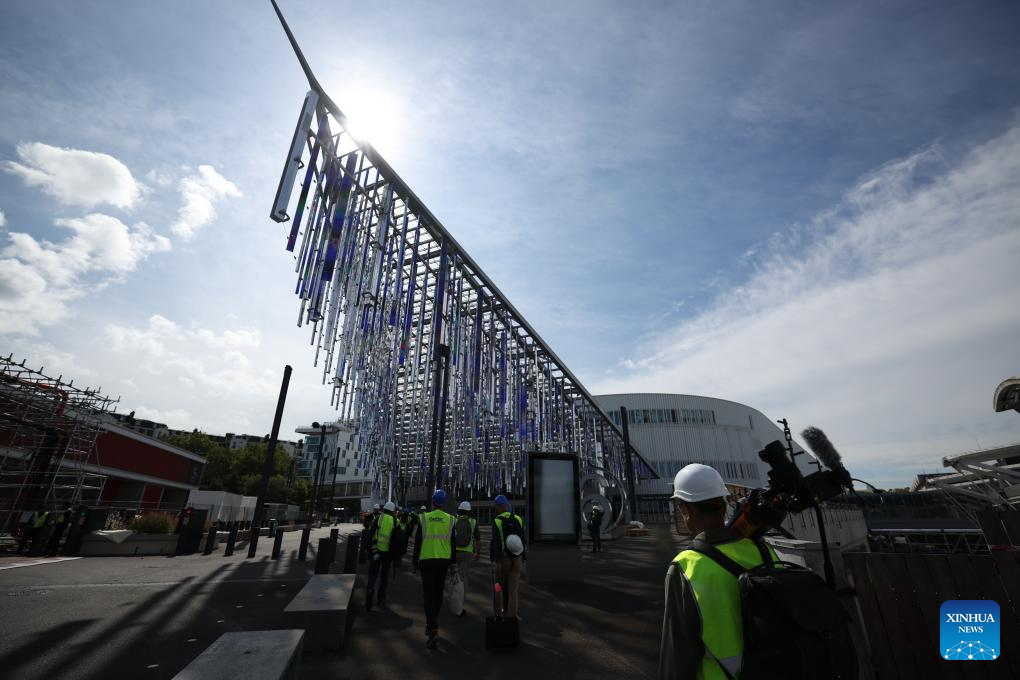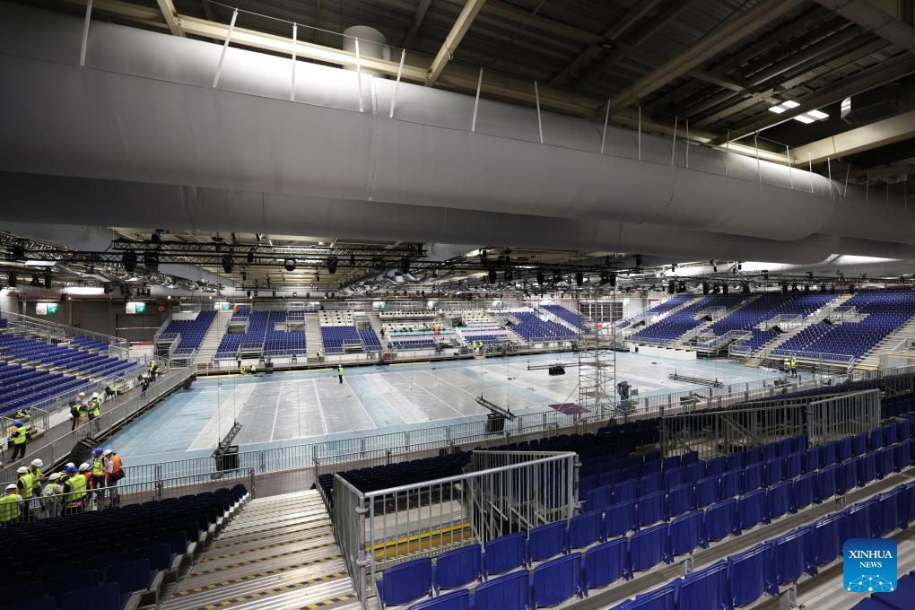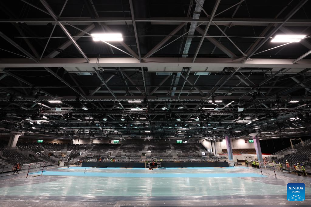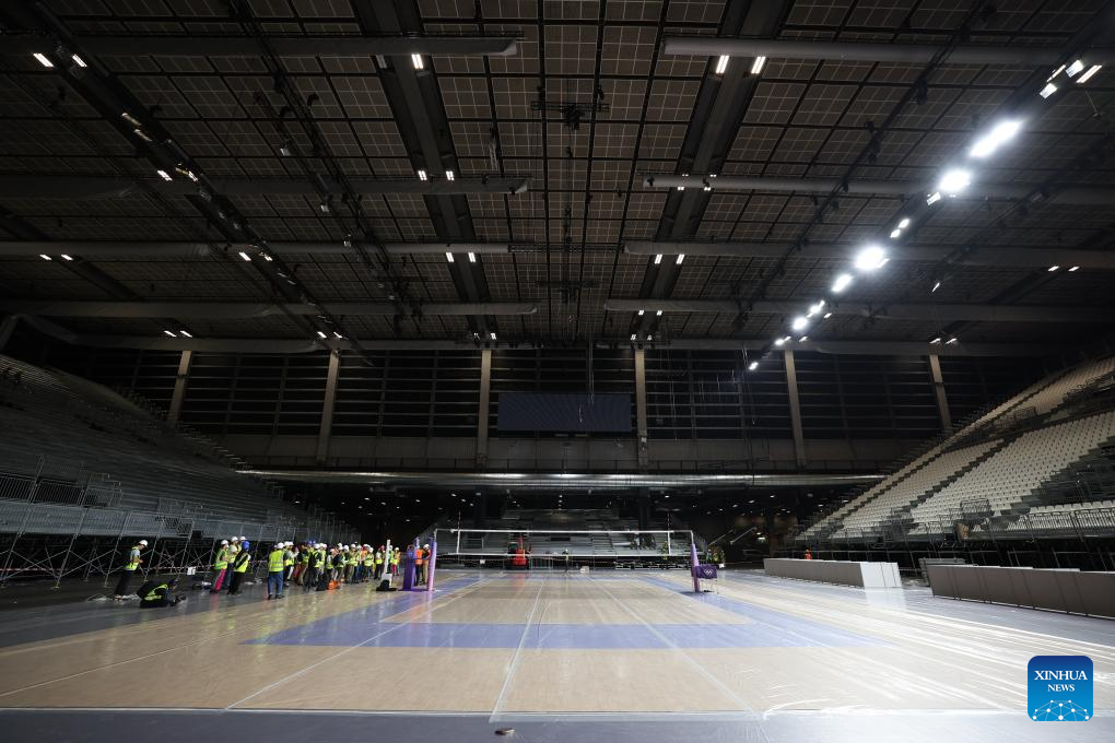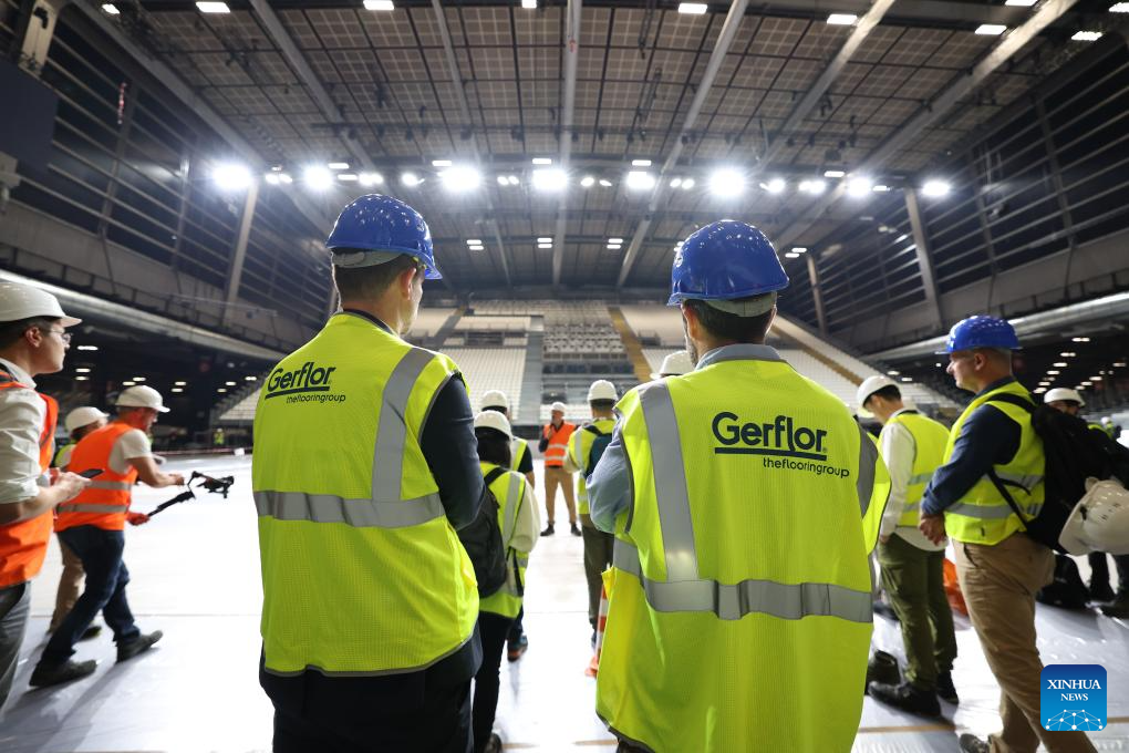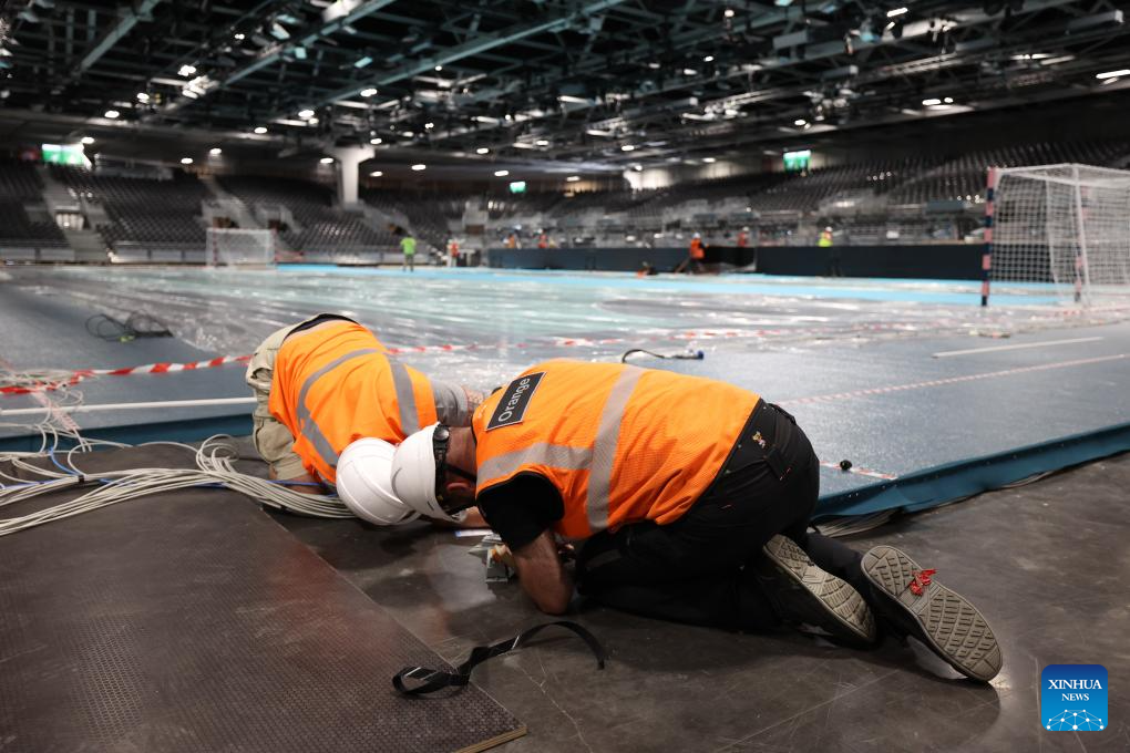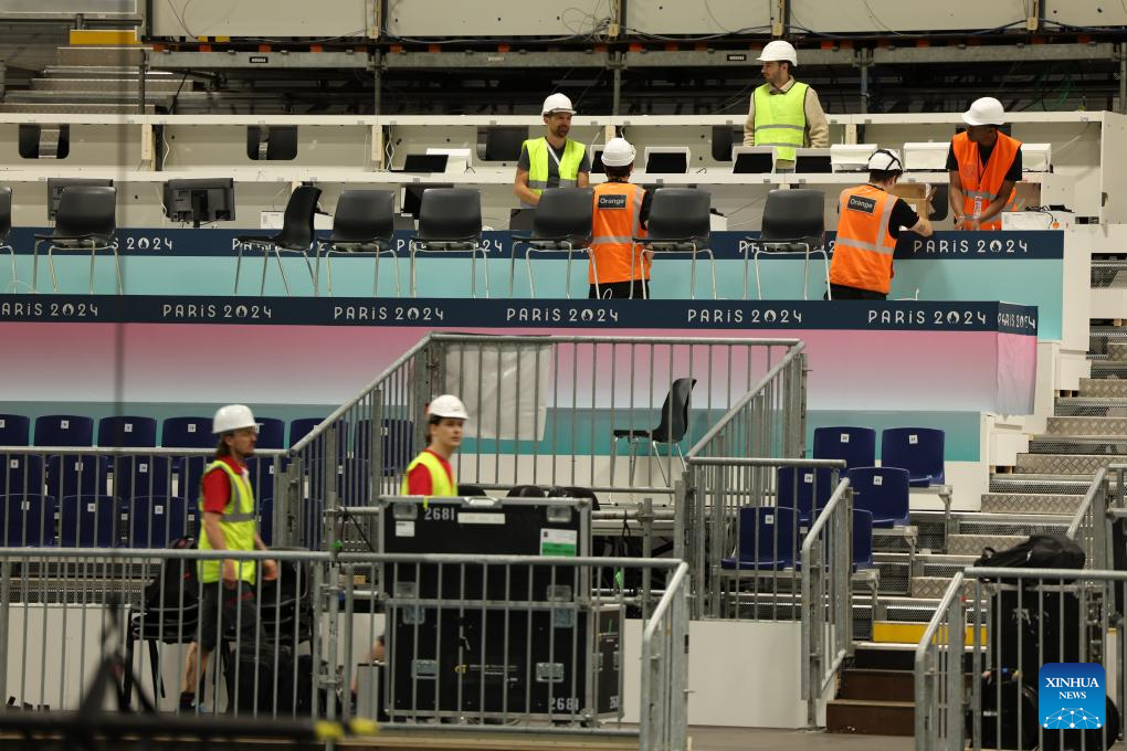 PARIS, 11 julio, 2024 (Xinhua) -- Empleados trabajan en la París Sur Arena, en París, Francia, el 11 de julio de 2024. La París Sur Arena albergará eventos deportivos como halterofilia, balonmano, tenis de mesa y voleibol durante los Juegos Olímpicos de París 2024. (Xinhua/Julien Mattia)