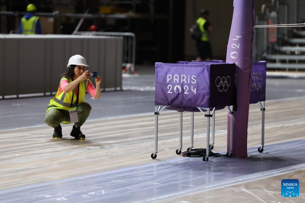 PARIS, 11 julio, 2024 (Xinhua) -- Una periodista toma fotografías de las instalaciones deportivas en la París Sur Arena, en París, Francia, el 11 de julio de 2024. La París Sur Arena albergará eventos deportivos como halterofilia, balonmano, tenis de mesa y voleibol durante los Juegos Olímpicos de París 2024. (Xinhua/Julien Mattia)