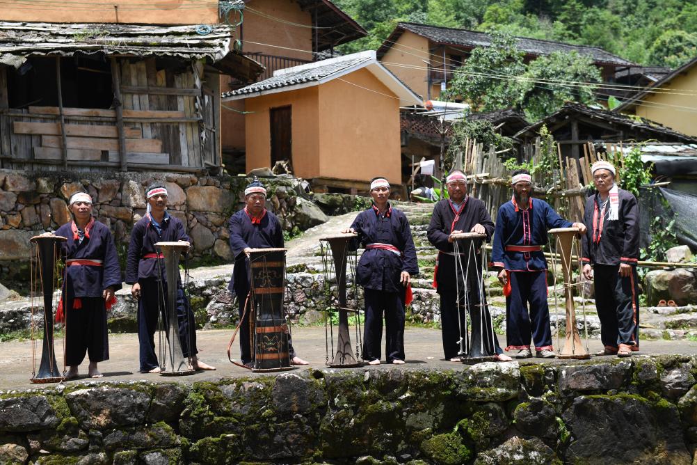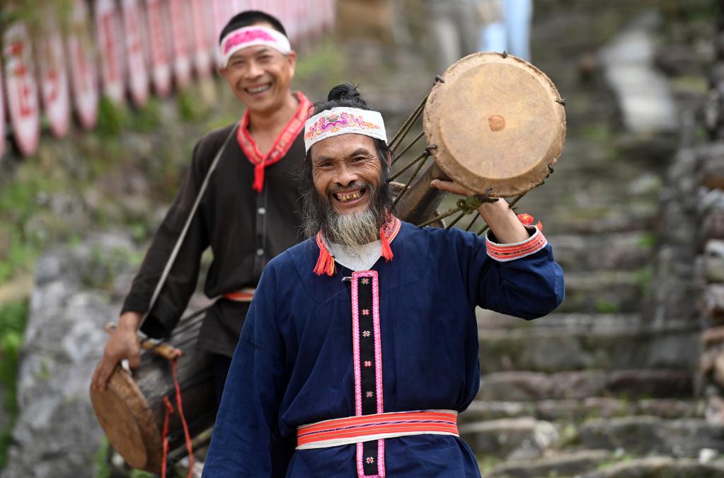 JINXIU, 11 julio, 2024 (Xinhua) -- Imagen del 1 de agosto de 2018 de aldeanos posando para fotografías después de realizar una presentación de la danza de tambor de barro amarillo, en el distrito autónomo yao de Jinxiu, en la región autónoma de la etnia zhuang de Guangxi, en el sur de China. La danza de tambor de barro amarillo del grupo étnico yao fue enlistada como patrimonio cultural inmaterial nacional. (Xinhua/Lu Boan)