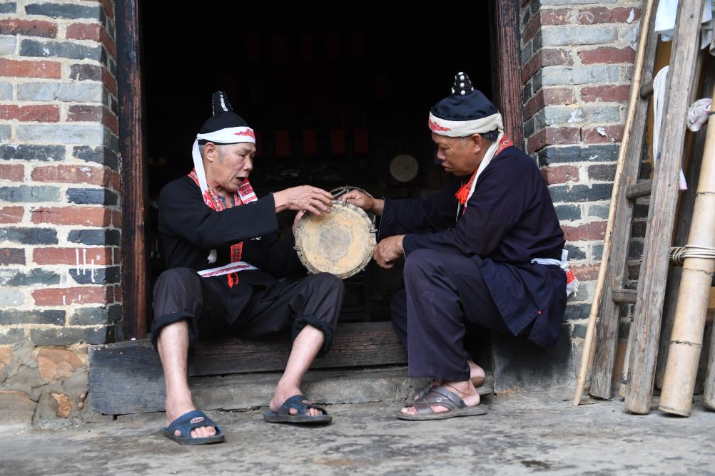 JINXIU, 11 julio, 2024 (Xinhua) -- Imagen del 1 de agosto de 2018 de Pan Zhensong (i), heredero de la danza de tambor de barro amarillo, y su hermano Pan Zhiming, heredero de las técnicas de elaboración de tambores de barro amarillo, estudiando un tambor de barro amarillo, en el distrito autónomo yao de Jinxiu, en la región autónoma de la etnia zhuang de Guangxi, en el sur de China. La danza de tambor de barro amarillo del grupo étnico yao fue enlistada como patrimonio cultural inmaterial nacional. (Xinhua/Lu Boan)
