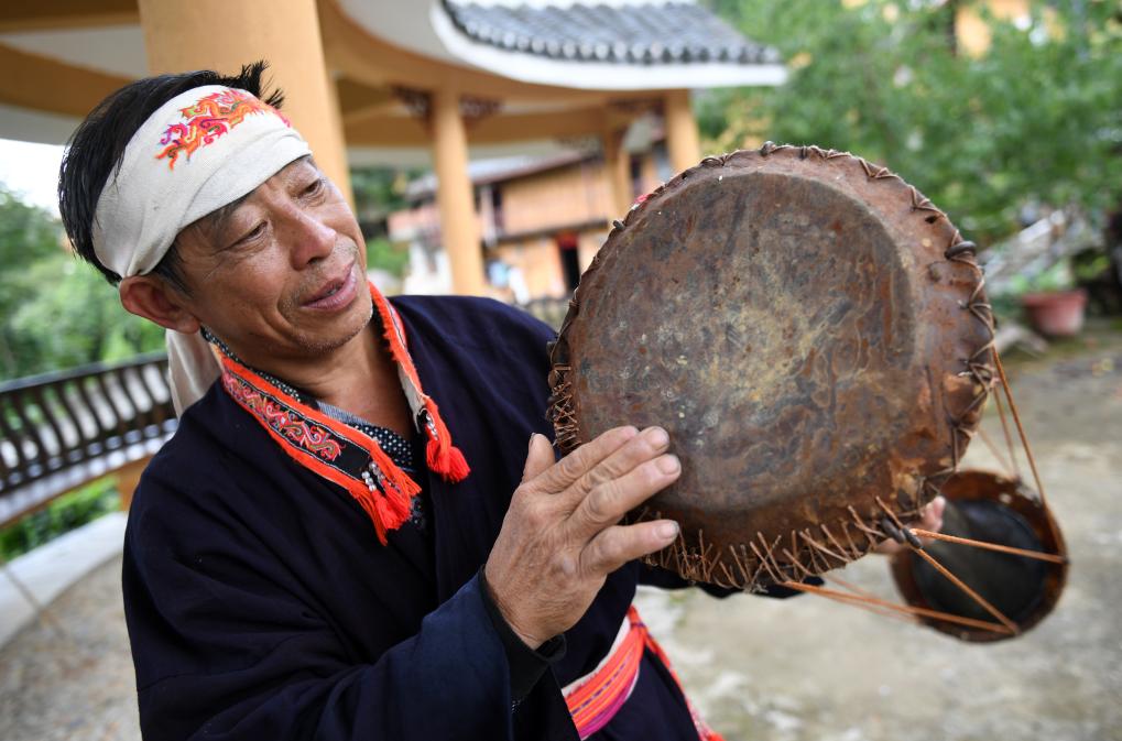 JINXIU, 11 julio, 2024 (Xinhua) -- Imagen del 1 de agosto de 2018 de Pan Zhibing, heredero de la danza de tambor de barro amarillo, revisando un tambor de barro amarillo, en el distrito autónomo yao de Jinxiu, en la región autónoma de la etnia zhuang de Guangxi, en el sur de China. La danza de tambor de barro amarillo del grupo étnico yao fue enlistada como patrimonio cultural inmaterial nacional. (Xinhua/Lu Boan)