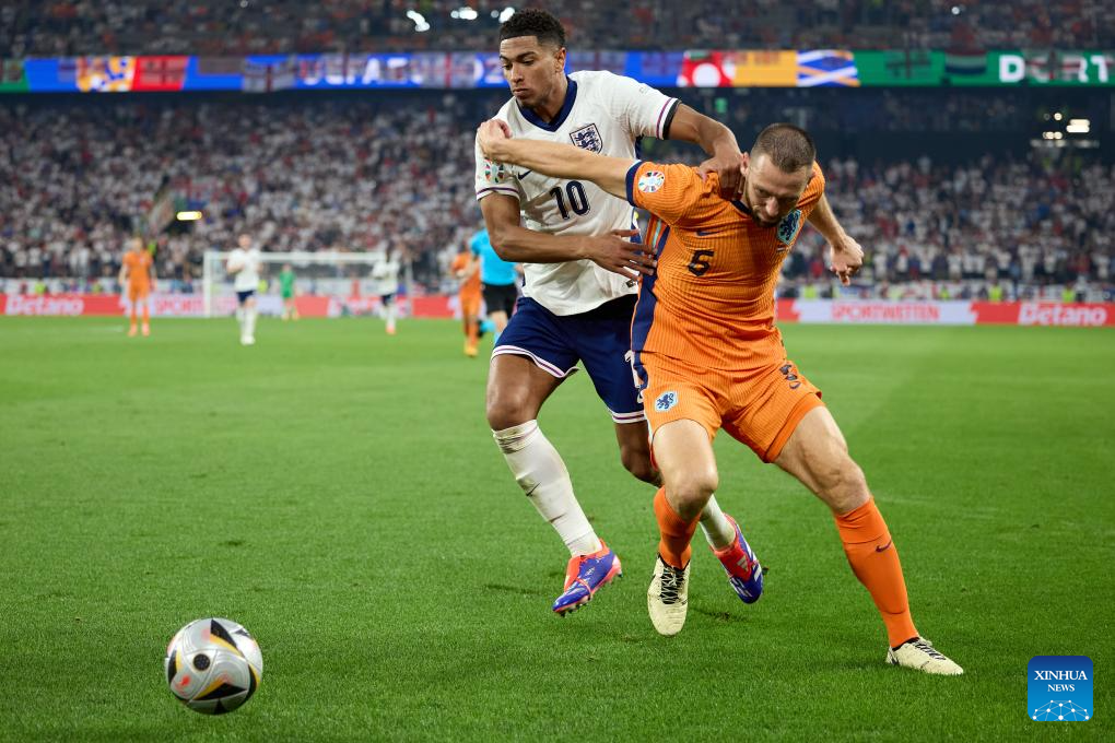 DORTMUND, 11 julio, 2024 (Xinhua) -- Imagen del 10 de julio de 2024 de Jude Bellingham (i), de Inglaterra, disputando el balón con Stefan de Vrij, de Países Bajos, durante el partido correspondiente a la semifinal de la EURO 2024 de la UEFA, entre Inglaterra y Países Bajos, en Dortmund, Alemania. (Xinhua/Meng Dingbo)