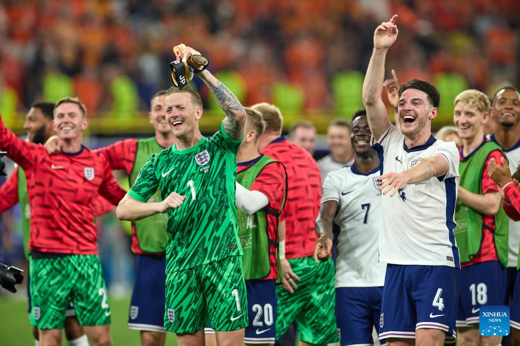 DORTMUND, 11 julio, 2024 (Xinhua) -- Imagen del 10 de julio de 2024 de jugadores de Inglaterra festejando la victoria al término del partido correspondiente a la semifinal de la EURO 2024 de la UEFA, entre Inglaterra y Países Bajos, en Dortmund, Alemania. (Xinhua/Meng Dingbo)
