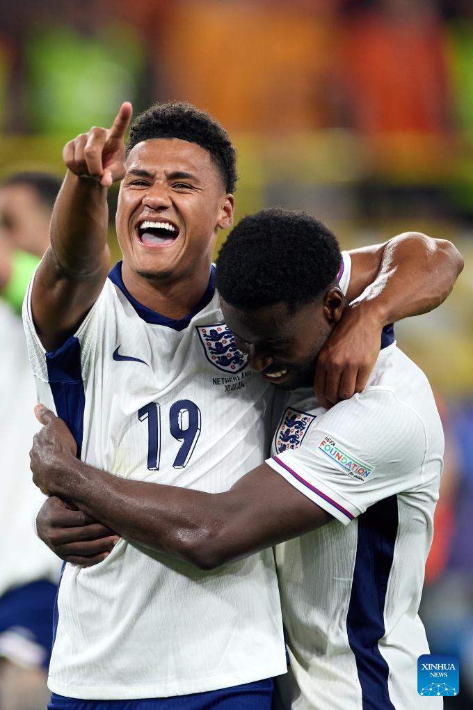 DORTMUND, 11 julio, 2024 (Xinhua) -- Imagen del 10 de julio de 2024 de Ollie Watkins (i), de Inglaterra, festejando la victoria con su compañero Marc Guehi, al término del partido correspondiente a la semifinal de la EURO 2024 de la UEFA, entre Inglaterra y Países Bajos, en Dortmund, Alemania. (Xinhua/Meng Dingbo)