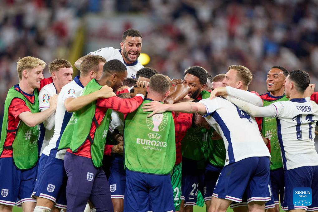 DORTMUND, 11 julio, 2024 (Xinhua) -- Imagen del 10 de julio de 2024 de jugadores de Inglaterra festejando una anotación durante el partido correspondiente a la semifinal de la EURO 2024 de la UEFA, entre Inglaterra y Países Bajos, en Dortmund, Alemania. (Xinhua/Meng Dingbo)