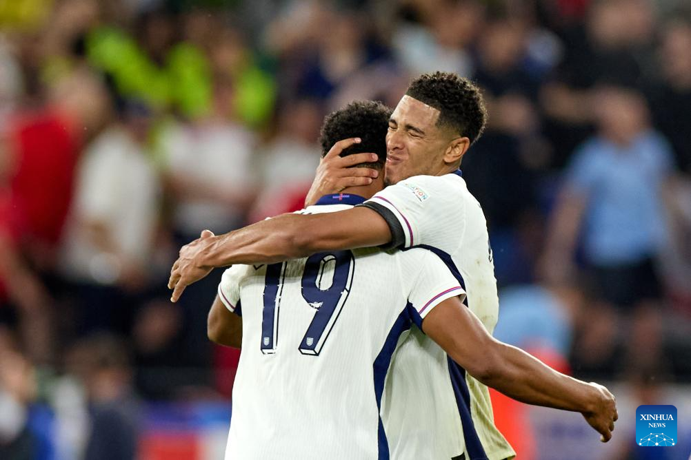 DORTMUND, 11 julio, 2024 (Xinhua) -- Imagen del 10 de julio de 2024 de Ollie Watkins (i), de Inglaterra, festejando una anotación con su compañero Jude Bellingham durante el partido correspondiente a la semifinal de la EURO 2024 de la UEFA, entre Inglaterra y Países Bajos, en Dortmund, Alemania. (Xinhua/Meng Dingbo)