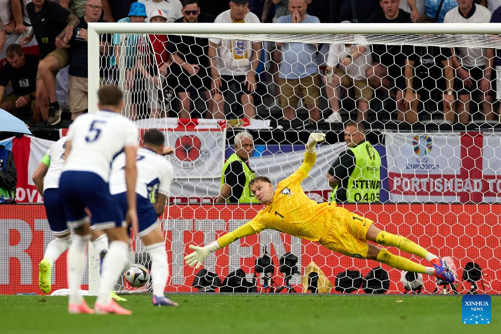 DORTMUND, 11 julio, 2024 (Xinhua) -- Imagen del 10 de julio de 2024 del guardameta Bart Verbruggen (d), de Países Bajos, fallando al atajar el balón durante el partido correspondiente a la semifinal de la EURO 2024 de la UEFA, entre Inglaterra y Países Bajos, en Dortmund, Alemania. (Xinhua/Meng Dingbo)