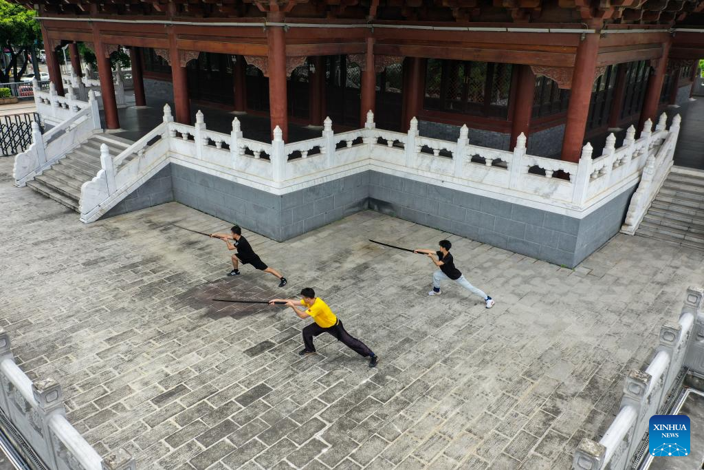 NANNING, 10 julio, 2024 (Xinhua) -- Imagen aérea del 6 de julio de 2024 de Gabriel de Moraes Neto (frente) practicando la habilidad del Miaodao, un sable largo a dos manos, con sus compañeros en un parque, en Nanning, en la región autónoma zhuang de Guangxi, en el sur de China. Nacido en 1978, Gabriel de Moraes Neto es oriundo de Río de Janeiro, Brasil. Actualmente es entrenador de artes marciales con sede en Nanning, Guangxi. Inspirado por el Kung Fu de Bruce Lee a temprana edad, Gabriel desarrolló un interés en las artes marciales chinas y comenzó a recibir entrenamiento sistemático en 1999. A medida que su comprensión de las artes marciales y la cultura tradicional china se profundizaba, se llamó a sí mismo "Mo Xiaolong", por el nombre chino de Bruce Lee, "Li Xiaolong". En 2008, Gabriel visitó la Universidad de Medicina China de Beijing como estudiante de intercambio para estudiar acupuntura mientras practicaba artes marciales. Para él, el Kung Fu encarna la medicina tradicional china (MTC) y el fortalecimiento físico, mostrando el encanto de la cultura china. Tras completar sus estudios, Gabriel regresó a Brasil, donde abrió una escuela especializada en entrenamiento de Kung Fu y cursos de acupuntura. En 2011, Gabriel volvió a visitar China y conoció a su alma gemela en Nanning, con quien se casó al año siguiente en Brasil. En 2016, Gabriel y su esposa regresaron a Nanning y decidieron quedarse y trabajar en China. Poco después de su regreso, Gabriel conoció al maestro local de artes marciales Cai Rongkun y se convirtió en entrenador en un club local de artes marciales. En su tiempo libre, a Gabriel le gusta montar bicicleta, el té chino y la caligrafía, al tiempo que aprende técnicas médicas de los practicantes locales de MTC. El comparte sus ideas sobre la cultura de las artes marciales y de la medicina tradicional china en sus cuentas de redes sociales, atrayendo a un importante número de seguidores internacionales. "La cultura tradicional china es realmente cautivadora. Estoy comprometido con el aprendizaje continuo", dijo Gabriel. Este año se celebra el 50 aniversario del establecimiento de relaciones diplomáticas entre China y Brasil. Como expatriado brasileño, Gabriel aspira a servir como embajador cultural para fomentar el entendimiento entre ambos países y promover las ricas tradiciones de China entre los brasileños. (Xinhua/Cao Yiming)