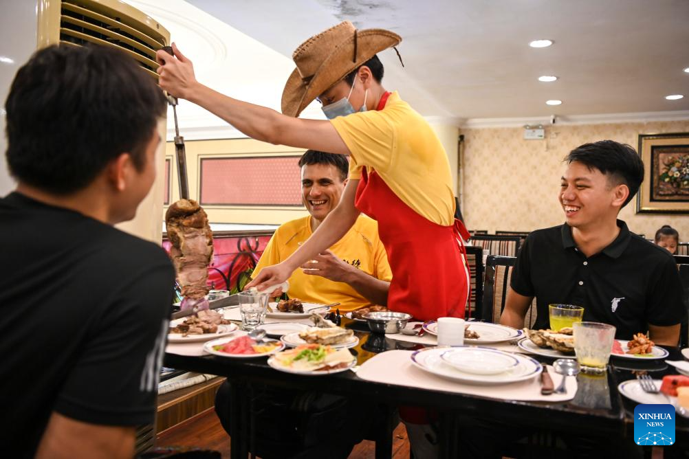 NANNING, 10 julio, 2024 (Xinhua) -- Imagen del 6 de julio de 2024 de Gabriel de Moraes Neto (2-i) comiendo carne asada brasileña con sus amigos, en Nanning, en la región autónoma zhuang de Guangxi, en el sur de China. Nacido en 1978, Gabriel de Moraes Neto es oriundo de Río de Janeiro, Brasil. Actualmente es entrenador de artes marciales con sede en Nanning, Guangxi. Inspirado por el Kung Fu de Bruce Lee a temprana edad, Gabriel desarrolló un interés en las artes marciales chinas y comenzó a recibir entrenamiento sistemático en 1999. A medida que su comprensión de las artes marciales y la cultura tradicional china se profundizaba, se llamó a sí mismo "Mo Xiaolong", por el nombre chino de Bruce Lee, "Li Xiaolong". En 2008, Gabriel visitó la Universidad de Medicina China de Beijing como estudiante de intercambio para estudiar acupuntura mientras practicaba artes marciales. Para él, el Kung Fu encarna la medicina tradicional china (MTC) y el fortalecimiento físico, mostrando el encanto de la cultura china. Tras completar sus estudios, Gabriel regresó a Brasil, donde abrió una escuela especializada en entrenamiento de Kung Fu y cursos de acupuntura. En 2011, Gabriel volvió a visitar China y conoció a su alma gemela en Nanning, con quien se casó al año siguiente en Brasil. En 2016, Gabriel y su esposa regresaron a Nanning y decidieron quedarse y trabajar en China. Poco después de su regreso, Gabriel conoció al maestro local de artes marciales Cai Rongkun y se convirtió en entrenador en un club local de artes marciales. En su tiempo libre, a Gabriel le gusta montar bicicleta, el té chino y la caligrafía, al tiempo que aprende técnicas médicas de los practicantes locales de MTC. El comparte sus ideas sobre la cultura de las artes marciales y de la medicina tradicional china en sus cuentas de redes sociales, atrayendo a un importante número de seguidores internacionales. "La cultura tradicional china es realmente cautivadora. Estoy comprometido con el aprendizaje continuo", dijo Gabriel. Este año se celebra el 50 aniversario del establecimiento de relaciones diplomáticas entre China y Brasil. Como expatriado brasileño, Gabriel aspira a servir como embajador cultural para fomentar el entendimiento entre ambos países y promover las ricas tradiciones de China entre los brasileños. (Xinhua/Cao Yiming)