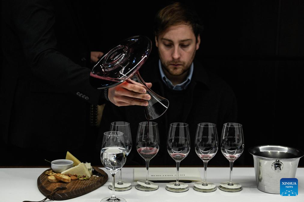 Imagen del 10 de julio de 2024 del sumiller de la Casona de "Don Melchor", Miguel Oqueli Mendoza, sirviendo una copa de vino durante una degustación de vinos denominada "Don Melchor Winemaking Experience", en la localidad de Pirque, en Santiago, Chile. Los vinos de Chile son invitados estrella en las mesas y estanterías de todo el mundo, estatus que las viñas del país sudamericano quieren aprovechar para posicionar a sus versiones de lujo, a través de su premiada calidad, innovadoras experiencias y un terruño privilegiado en las faldas de la cordillera de Los Andes. (Xinhua/Jorge Villegas)
