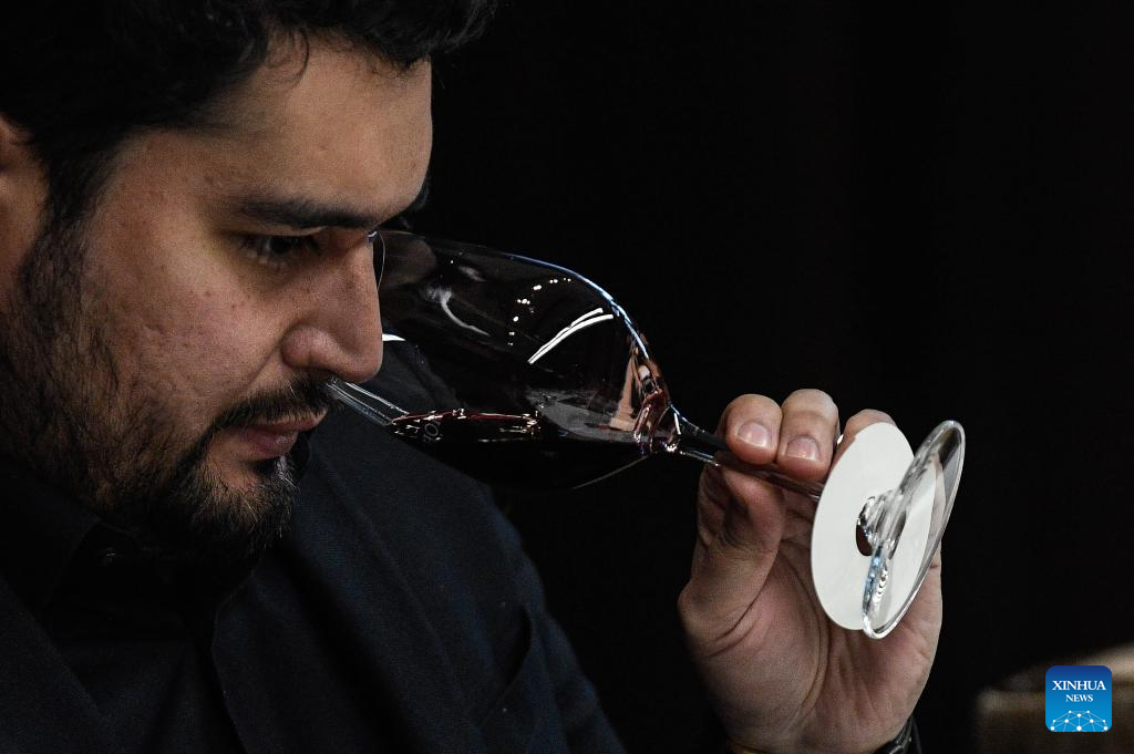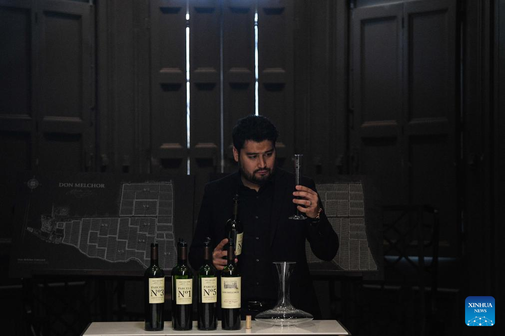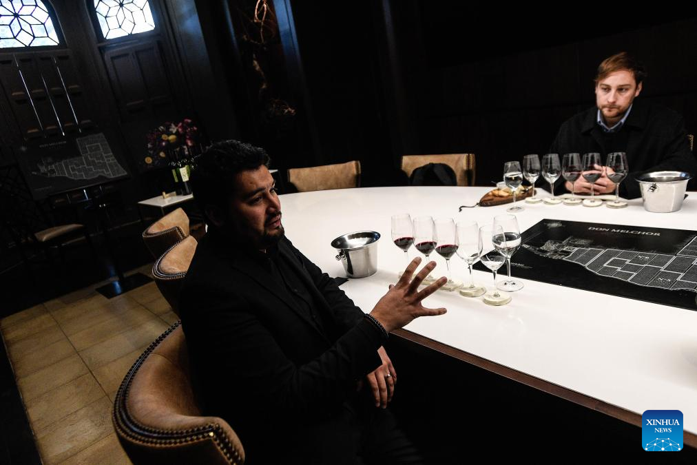 Imagen del 10 de julio de 2024 del sumiller de la Casona de "Don Melchor", Miguel Oqueli Mendoza, participando durante una degustación de vinos denominada "Don Melchor Winemaking Experience", en la localidad de Pirque, en Santiago, Chile. Los vinos de Chile son invitados estrella en las mesas y estanterías de todo el mundo, estatus que las viñas del país sudamericano quieren aprovechar para posicionar a sus versiones de lujo, a través de su premiada calidad, innovadoras experiencias y un terruño privilegiado en las faldas de la cordillera de Los Andes. (Xinhua/Jorge Villegas)