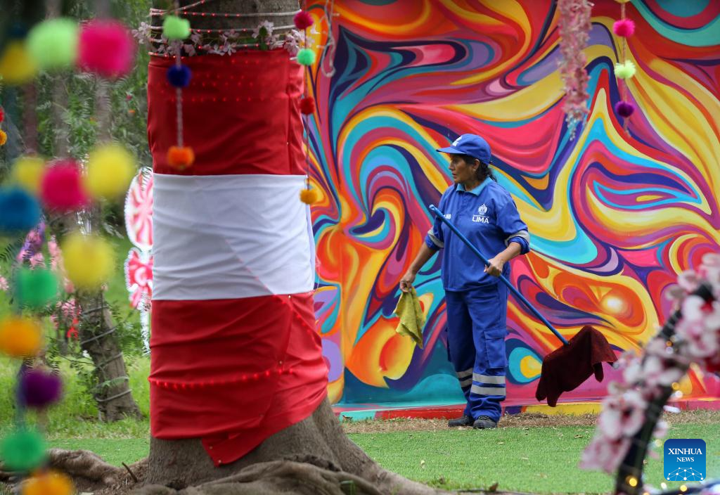 LIMA, 12 julio, 2024 (Xinhua) -- Imagen del 11 de julio de 2024 de una trabajadora municipal limpiando durante el festival "Te Amo Perú Fest", en Lima, Perú. Peruanos celebran con entusiasmo y patriotismo el festival "Te Amo Perú Fest" que se desarrolla del 5 al 31 de julio en la ciudad de Lima, en el marco del mes de las Fiestas Patrias (28 de julio) con el propósito de promover la integración familiar y la identidad nacional, al rendir homenaje a la diversidad natural y cultural de la nación sudamericana. (Xinhua/Mariana Bazo)