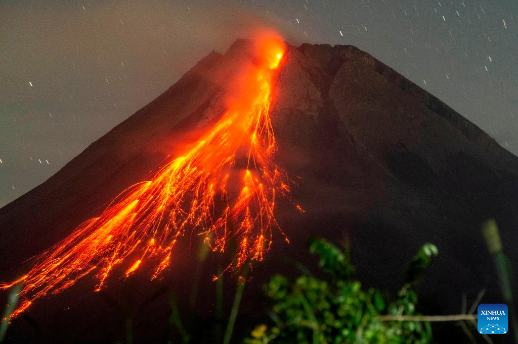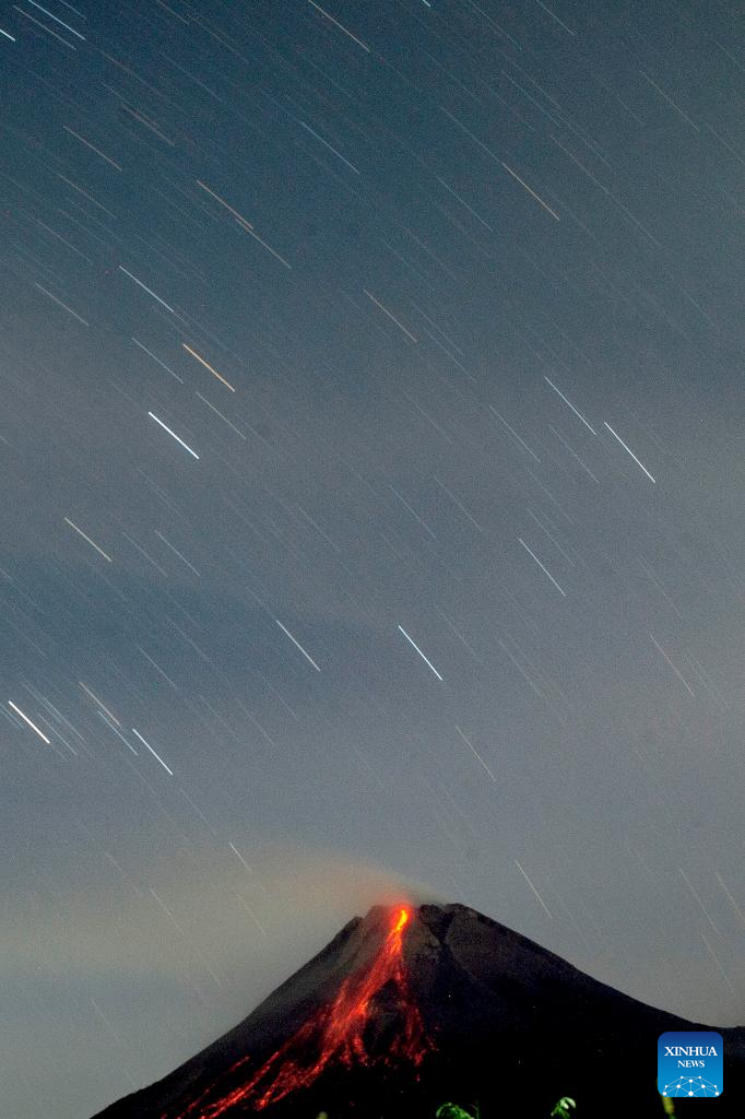 YOGYAKARTA, 12 julio, 2024 (Xinhua) -- Imagen de larga exposición de materiales volcánicos arrojados desde el monte Merapi vistos desde la aldea de Tunggul Arum, en Sleman, Yogyakarta, Indonesia, el 12 de julio de 2024. (Xinhua/Agung Supriyanto)