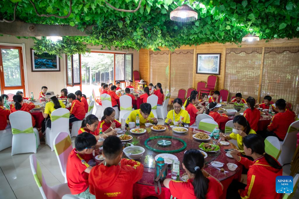 YICHUN, 12 julio, 2024 (Xinhua) -- Imagen del 11 de julio de 2024 de estudiantes que participan en un grupo de estudio e investigación comiendo en un restaurante, en Yichun, en la provincia de Heilongjiang, en el noreste de China. Yichun en la provincia de Heilongjiang, en el noreste de China, se convierte en un destino de viaje popular en verano. Con los abundantes recursos naturales forestales de la ciudad, muchos turistas vienen aquí por su aire fresco y suave temperatura. (Xinhua/Zhang Tao)