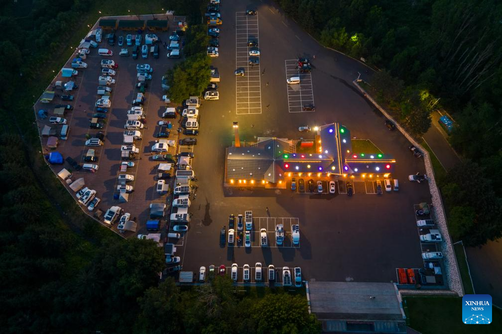 YICHUN, 12 julio, 2024 (Xinhua) -- Vista aérea tomada con un dron del 11 de julio de 2024 de vehículos estacionados en un campamento de vehículos recreativos, en el Parque Nacional Forestal de Xing'an, en Yichun, en la provincia de Heilongjiang, en el noreste de China. Yichun en la provincia de Heilongjiang, en el noreste de China, se convierte en un destino de viaje popular en verano. Con los abundantes recursos naturales forestales de la ciudad, muchos turistas vienen aquí por su aire fresco y suave temperatura. (Xinhua/Zhang Tao)