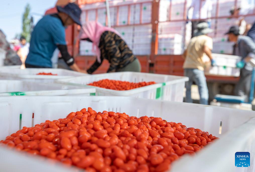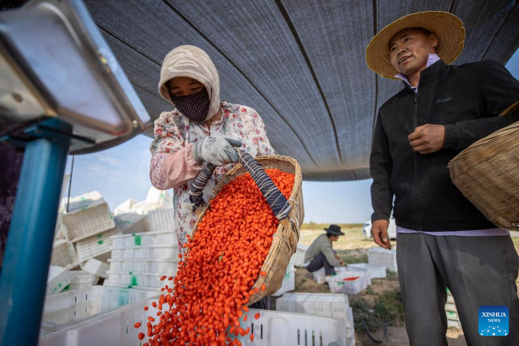WUZHONG, 11 julio, 2024 (Xinhua) -- Agricultores pesan bayas de goji cosechadas en una base de producción de bayas de goji, en el distrito de Tongxin de Wuzhong, en la región autónoma hui de Ningxia, en el noroeste de China, el 11 de julio de 2024. El distrito de Tongxin está atestiguando la temporada de cosecha de su base de bayas de goji de 51.000 mu (unas 3.400 hectáreas). (Xinhua/Yang Zhisen)