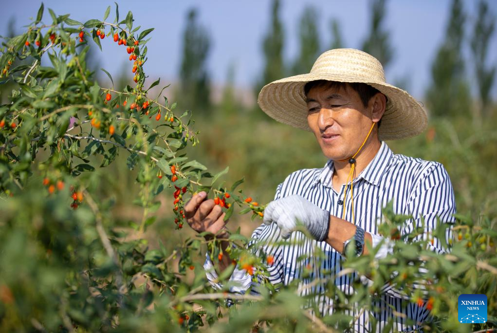 WUZHONG, 11 julio, 2024 (Xinhua) -- Un agricultor cosecha bayas de goji en una base de producción de bayas de goji, en el distrito de Tongxin de Wuzhong, en la región autónoma hui de Ningxia, en el noroeste de China, el 11 de julio de 2024. El distrito de Tongxin está atestiguando la temporada de cosecha de su base de bayas de goji de 51.000 mu (unas 3.400 hectáreas). (Xinhua/Yang Zhisen)