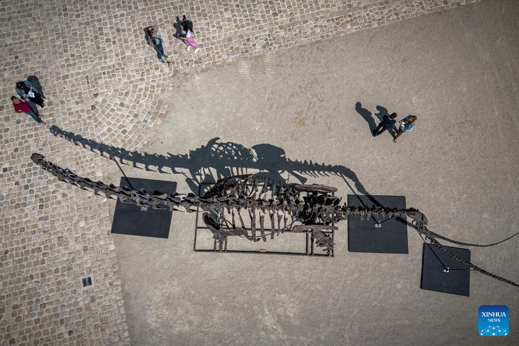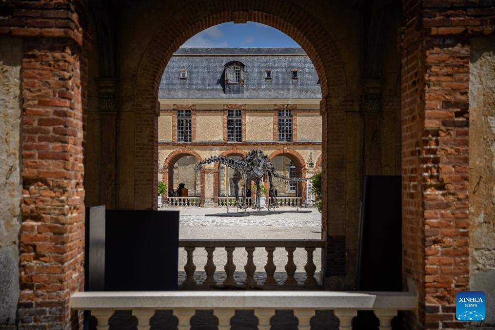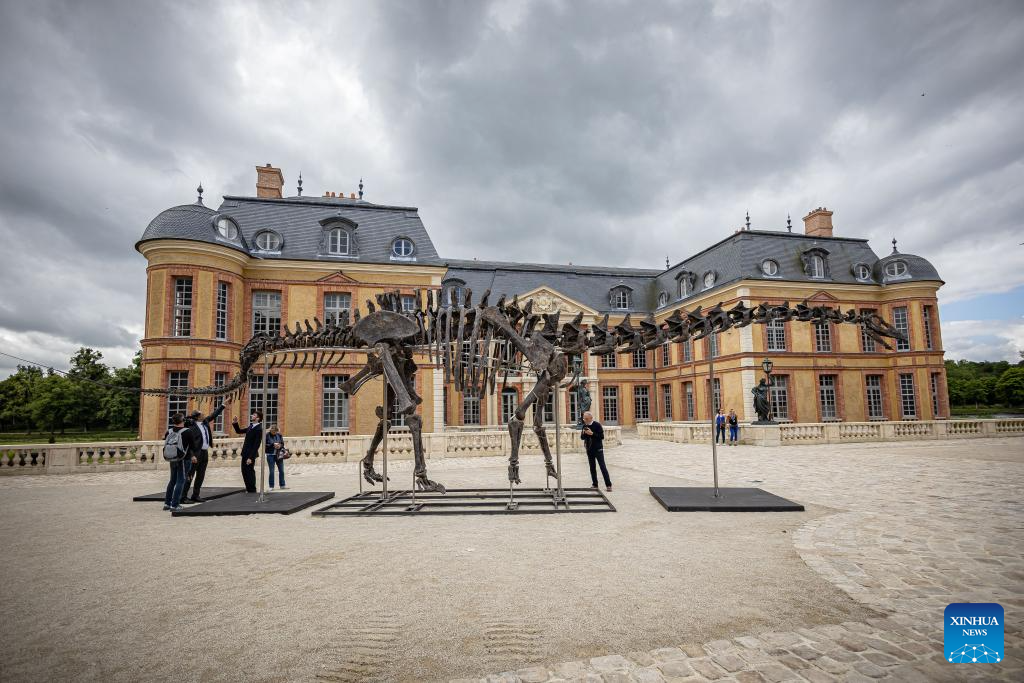 PARIS, 11 julio, 2024 (Xinhua) -- Imagen del 10 de julio de 2024 del esqueleto de un dinosaurio Apatosaurus exhibido en el castillo de Dampierre-en-Yvelines, en Dampierre-en-Yvelines, en el sur de París, Francia. Con 21 metros de largo, este esqueleto de hace unos 150 millones de años está previsto que sea subastado en noviembre de este año. (Xinhua/Aurelien Morissard)