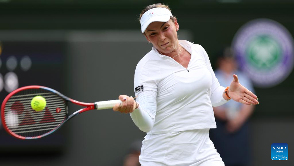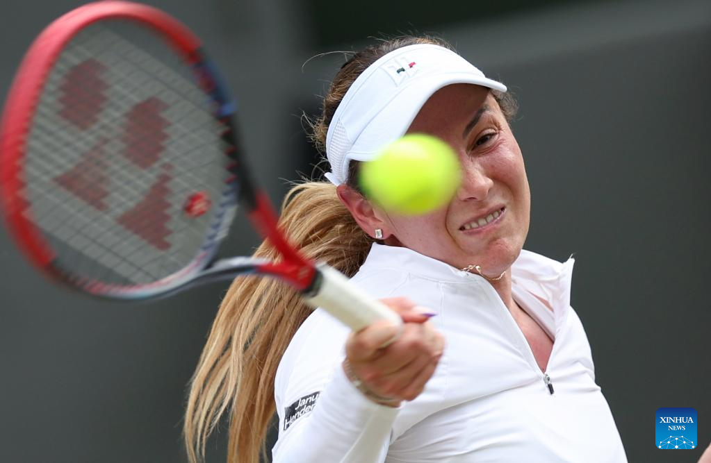 LONDRES, 12 julio, 2024 (Xinhua) -- Imagen del 11 de julio de 2024 de Donna Vekic devolviendo la pelota durante el partido de semifinal de individuales femeninos entre Jasmine Paolini, de Italia, y Donna Vekic, de Croacia, en el Campeonato de Tenis de Wimbledon, en Londres, Reino Unido. (Xinhua/Li Ying)