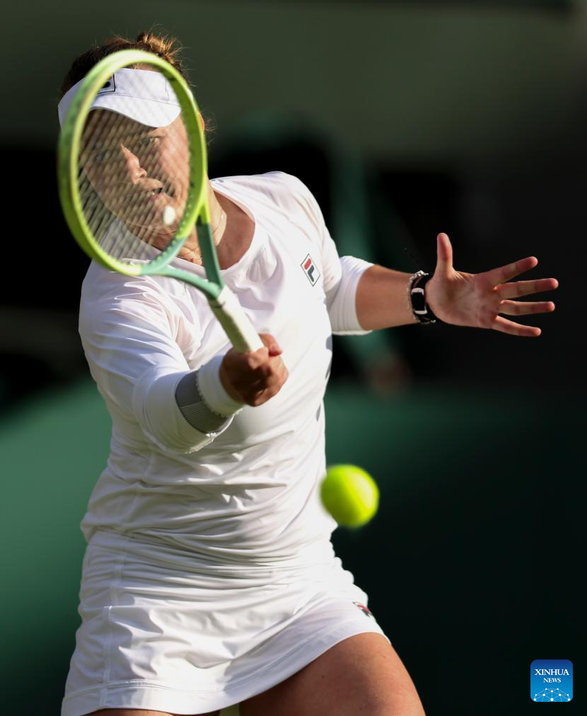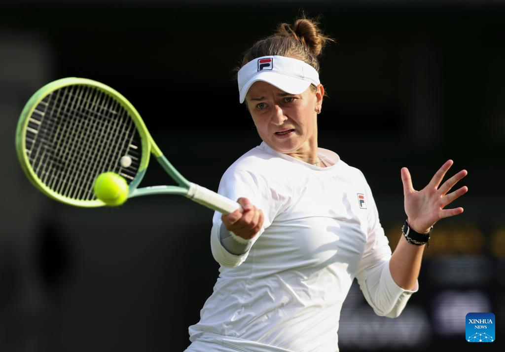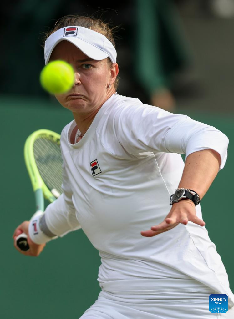 LONDRES, 12 julio, 2024 (Xinhua) -- Imagen del 11 de julio de 2024 de Barbora Krejcikova compitiendo durante el partido de semifinal de individuales femeninos entre Elena Rybakina, de Kazajistán, y Barbora Krejcikova, de República Checa, en el Campeonato de Tenis de Wimbledon, en Londres, Reino Unido. (Xinhua/Han Yan)