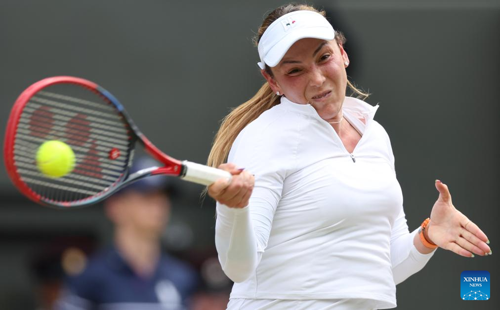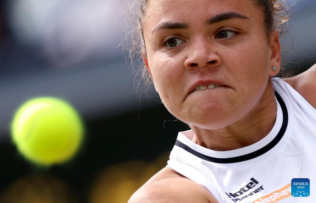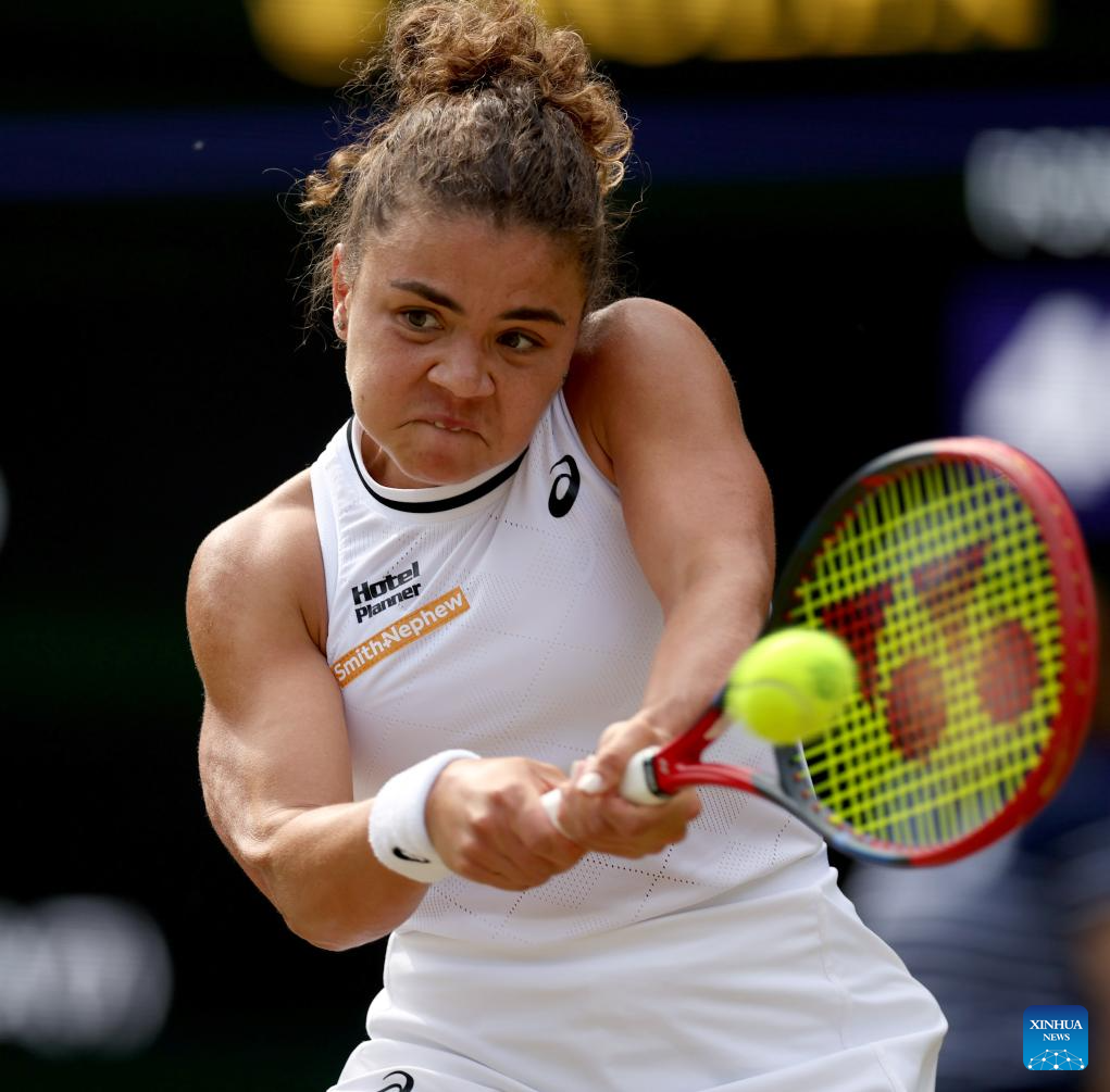 LONDRES, 12 julio, 2024 (Xinhua) -- Imagen del 11 de julio de 2024 de Jasmine Paolini devolviendo la pelota durante el partido de semifinal de individuales femeninos entre Jasmine Paolini, de Italia, y Donna Vekic, de Croacia, en el Campeonato de Tenis de Wimbledon, en Londres, Reino Unido. (Xinhua/Li Ying)