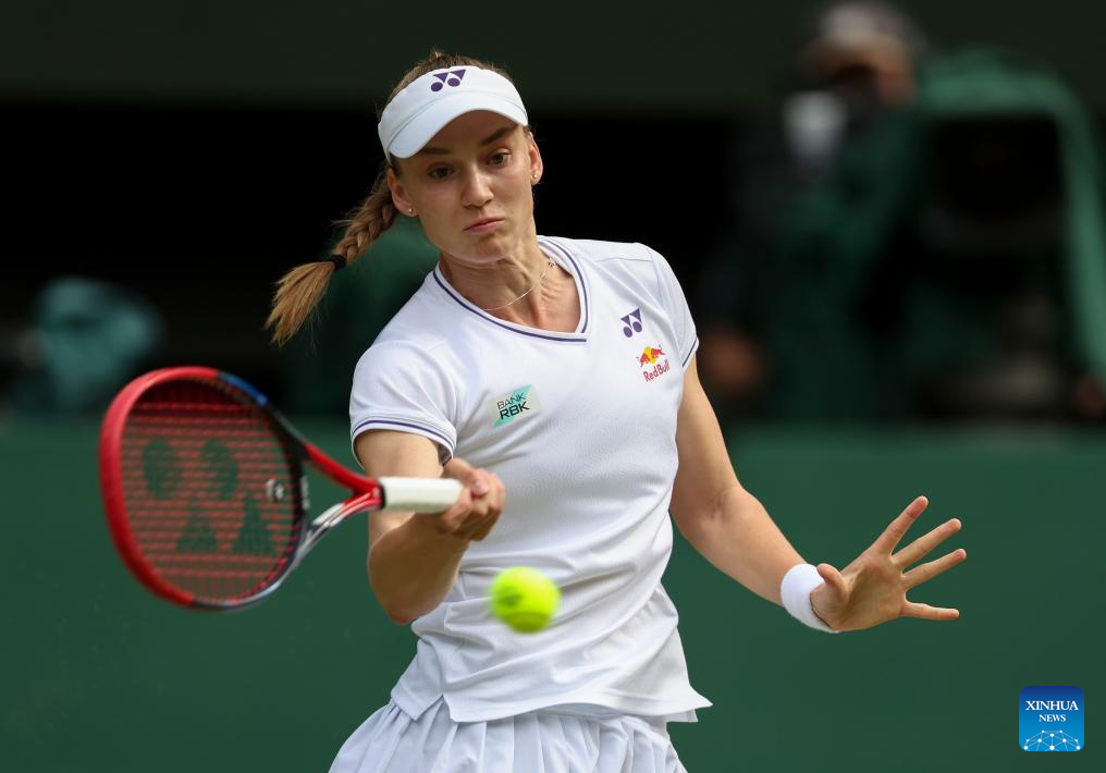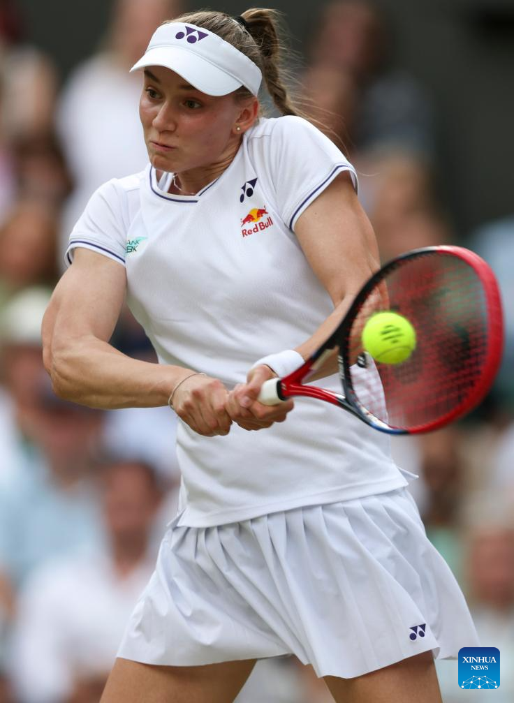 LONDRES, 12 julio, 2024 (Xinhua) -- Imagen del 11 de julio de 2024 de Elena Rybakina compitiendo durante el partido de semifinal de individuales femeninos entre Elena Rybakina, de Kazajistán, y Barbora Krejcikova, de República Checa, en el Campeonato de Tenis de Wimbledon, en Londres, Reino Unido. (Xinhua/Han Yan)