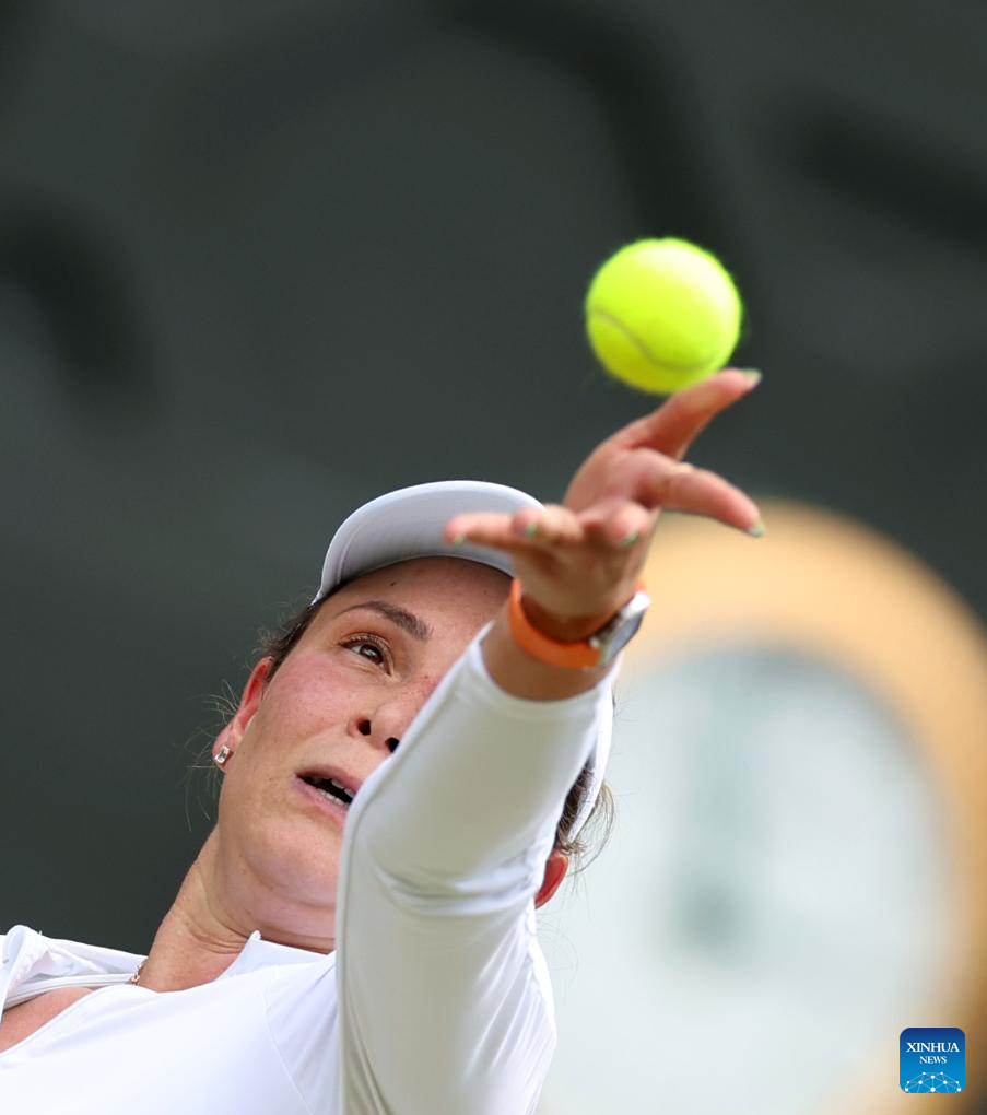 LONDRES, 12 julio, 2024 (Xinhua) -- Imagen del 11 de julio de 2024 de Donna Vekic sirviendo la pelota durante el partido de semifinal de individuales femeninos entre Jasmine Paolini, de Italia, y Donna Vekic, de Croacia, en el Campeonato de Tenis de Wimbledon, en Londres, Reino Unido. (Xinhua/Li Ying)