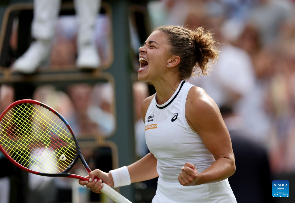 LONDRES, 12 julio, 2024 (Xinhua) -- Imagen del 11 de julio de 2024 de Jasmine Paolini festejando la victoria después del partido de semifinal de individuales femeninos entre Jasmine Paolini, de Italia, y Donna Vekic, de Croacia, en el Campeonato de Tenis de Wimbledon, en Londres, Reino Unido. (Xinhua/Li Ying)