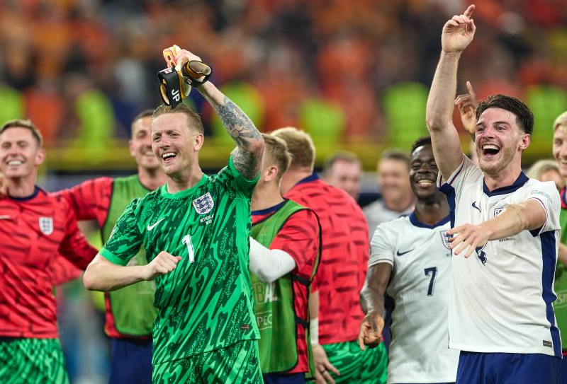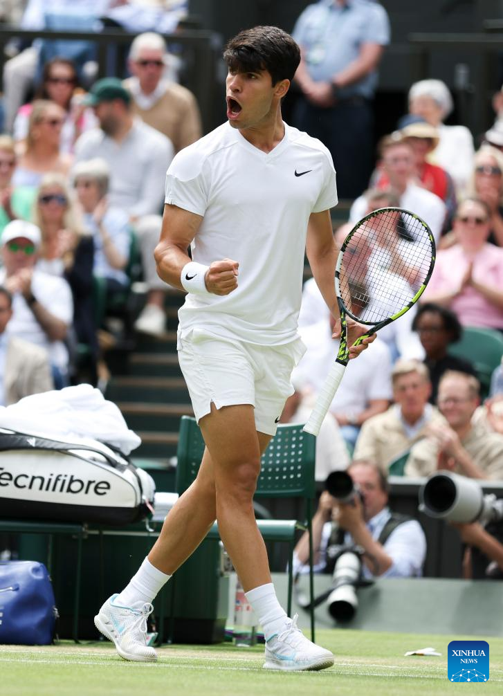 LONDRES, 12 julio, 2024 (Xinhua) -- Carlos Alcaraz, de España, reacciona durante el partido de semifinal de individuales masculinos entre Daniil Medvedev, de Rusia, y Carlos Alcaraz, de España, en el Campeonato de Tenis de Wimbledon, en Londres, Reino Unido, el 12 de julio de 2024. (Xinhua/Han Yan)