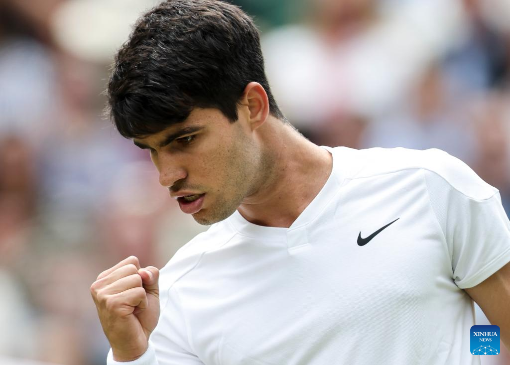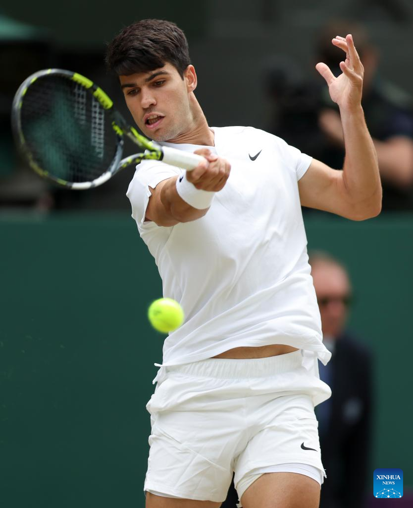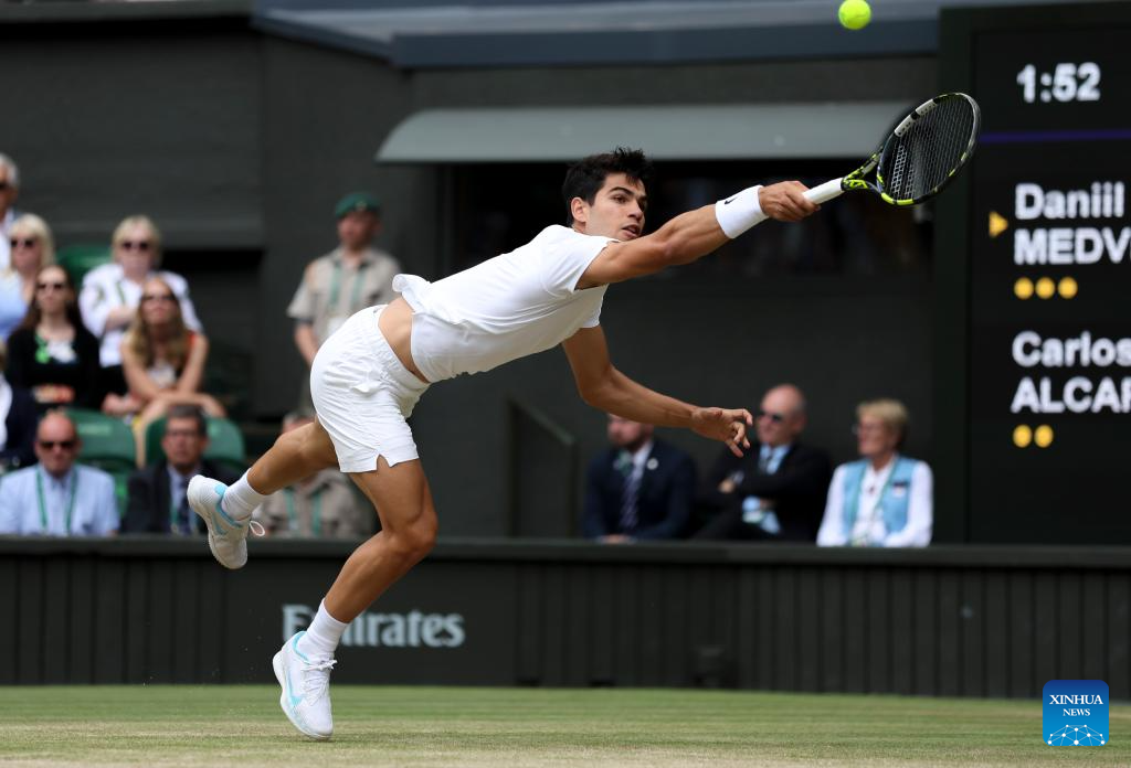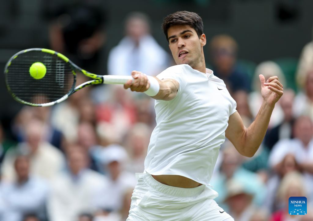 LONDRES, 12 julio, 2024 (Xinhua) -- Carlos Alcaraz, de España, devuelve la pelota durante el partido de semifinal de individuales masculinos entre Daniil Medvedev, de Rusia, y Carlos Alcaraz, de España, en el Campeonato de Tenis de Wimbledon, en Londres, Reino Unido, el 12 de julio de 2024. (Xinhua/Han Yan)