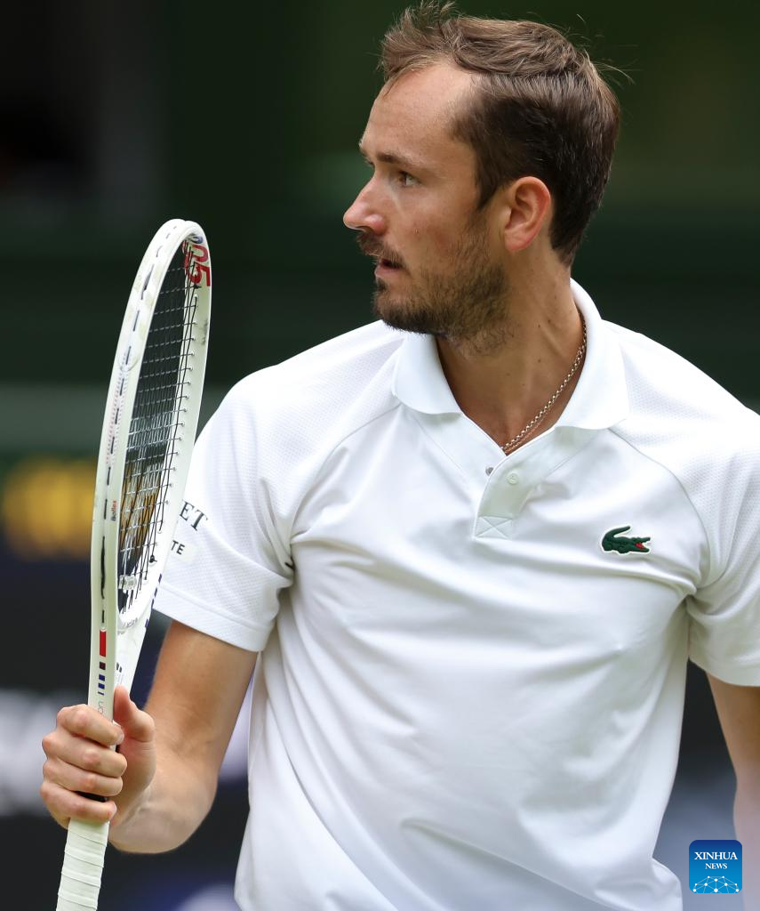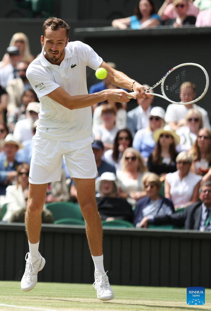 LONDRES, 12 julio, 2024 (Xinhua) -- Daniil Medvedev, de Rusia, devuelve la pelota durante el partido de semifinal de individuales masculinos entre Daniil Medvedev, de Rusia, y Carlos Alcaraz, de España, en el Campeonato de Tenis de Wimbledon, en Londres, Reino Unido, el 12 de julio de 2024. (Xinhua/Han Yan)