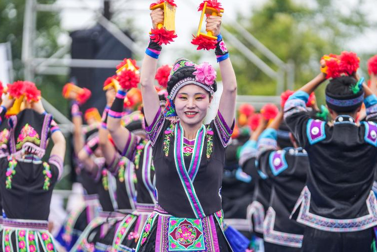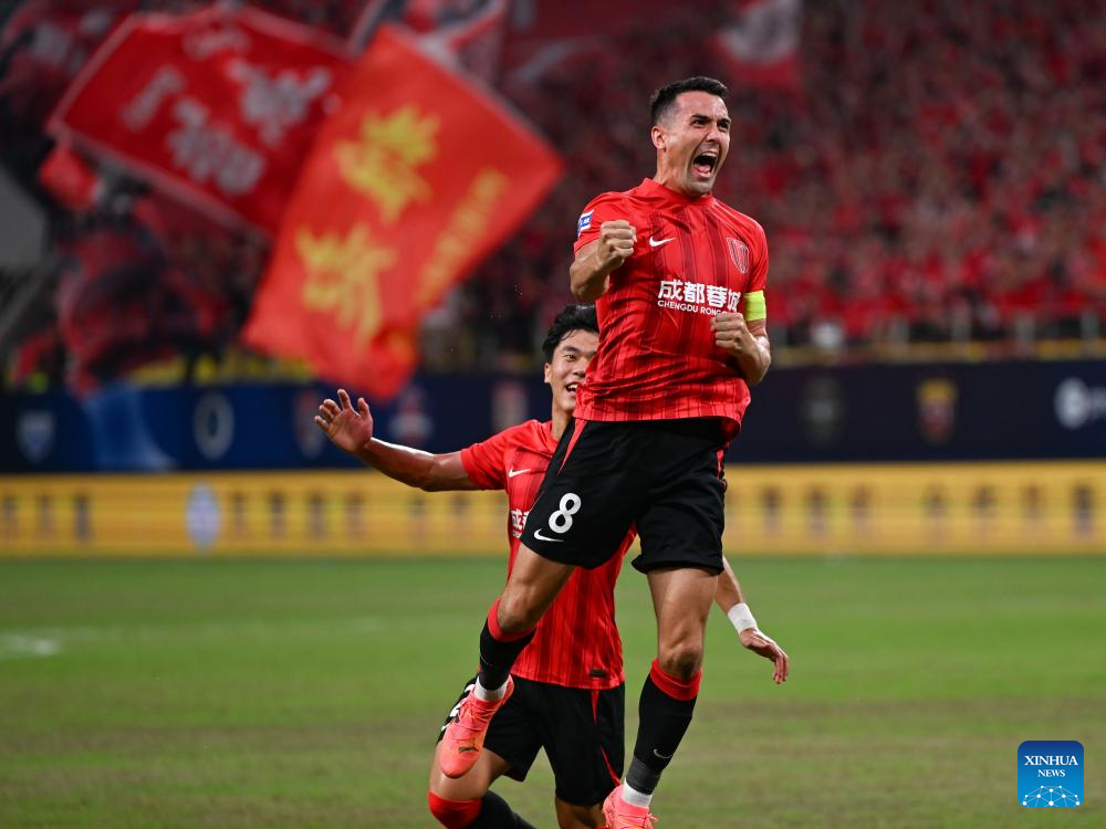 CHENGDU, 12 julio, 2024 (Xinhua) -- Zhou Dingyang (arriba), de Chengdu Rongcheng, festeja una anotación durante el partido correspondiente a la jornada 19 de la temporada 2024 de la Superliga de la Asociación de Fútbol de China (CSL), entre Chengdu Rongcheng y Tianjin Jinmen Tiger, en Chengdu, en la provincia de Sichuan, en el suroeste de China, el 12 de julio de 2024. (Xinhua/Wang Xi)
