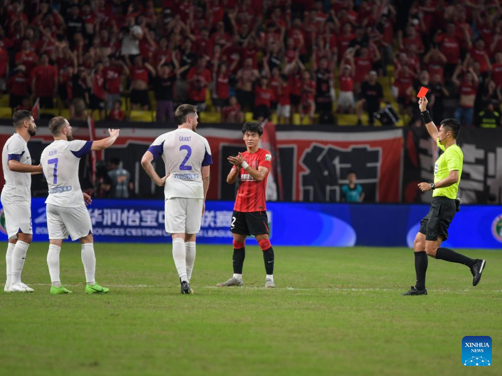 CHENGDU, 12 julio, 2024 (Xinhua) -- El árbitro Ma Ning (d) muestra una tarjeta roja a Xadas (i), de Tianjin Jinmen Tiger, durante el partido correspondiente a la jornada 19 de la temporada 2024 de la Superliga de la Asociación de Fútbol de China (CSL), entre Chengdu Rongcheng y Tianjin Jinmen Tiger, en Chengdu, en la provincia de Sichuan, en el suroeste de China, el 12 de julio de 2024. (Xinhua/Wang Xi)