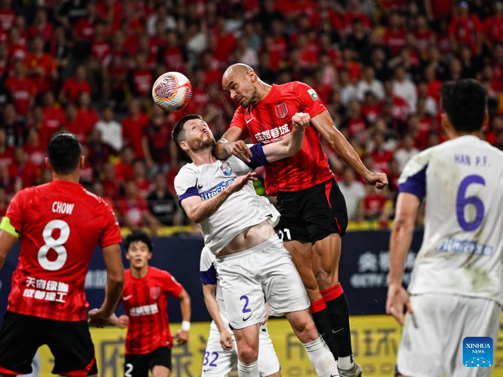 CHENGDU, 12 julio, 2024 (Xinhua) -- Felipe Silva (d-arriba), de Chengdu Rongcheng, disputa un cabezazo durante el partido correspondiente a la jornada 19 de la temporada 2024 de la Superliga de la Asociación de Fútbol de China (CSL), entre Chengdu Rongcheng y Tianjin Jinmen Tiger, en Chengdu, en la provincia de Sichuan, en el suroeste de China, el 12 de julio de 2024. (Xinhua/Wang Xi)