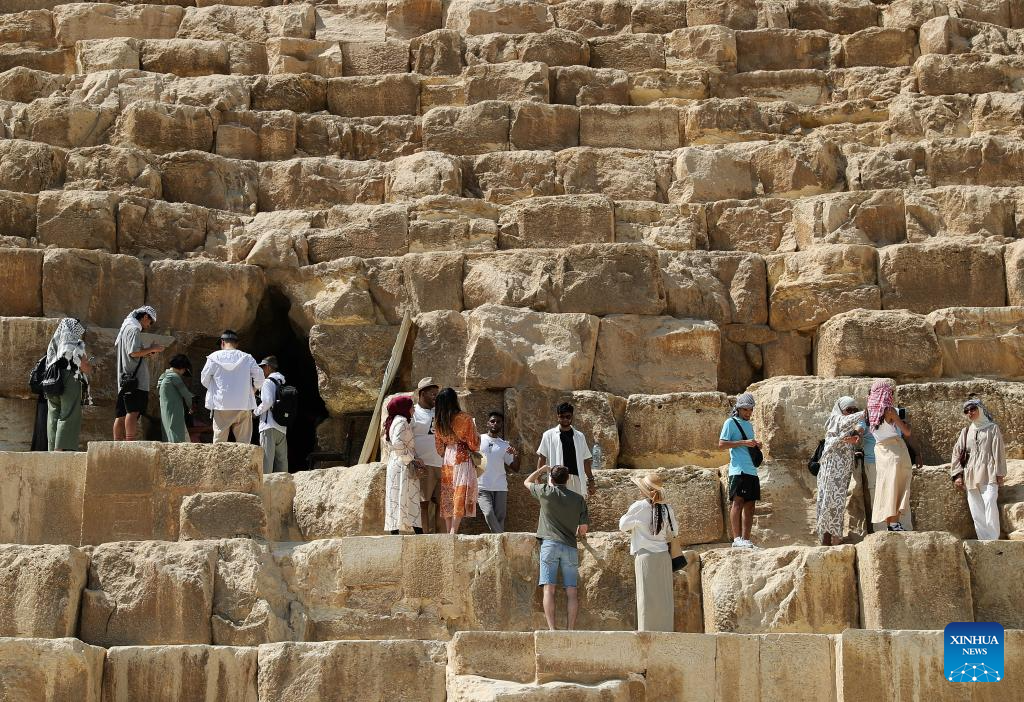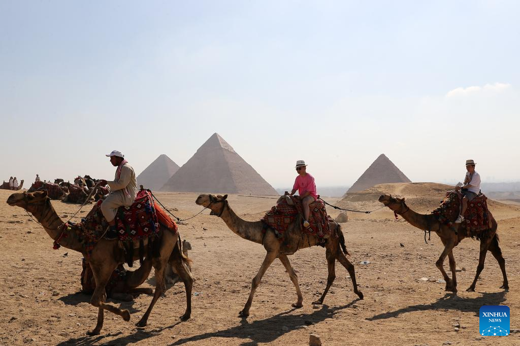EL CAIRO, 14 julio, 2024 (Xinhua) -- Turistas visitan el punto escénico de las Pirámides de Giza, en Giza, Egipto, el 14 de julio de 2024. El ingreso turístico de Egipto alcanzó los 6,6 billones de dólares estadounidenses en el primer semestre de 2024, sobrepasando los 6,3 billones de dólares durante el mismo periodo en 2023. (Xinhua/Wang Dongzhen)