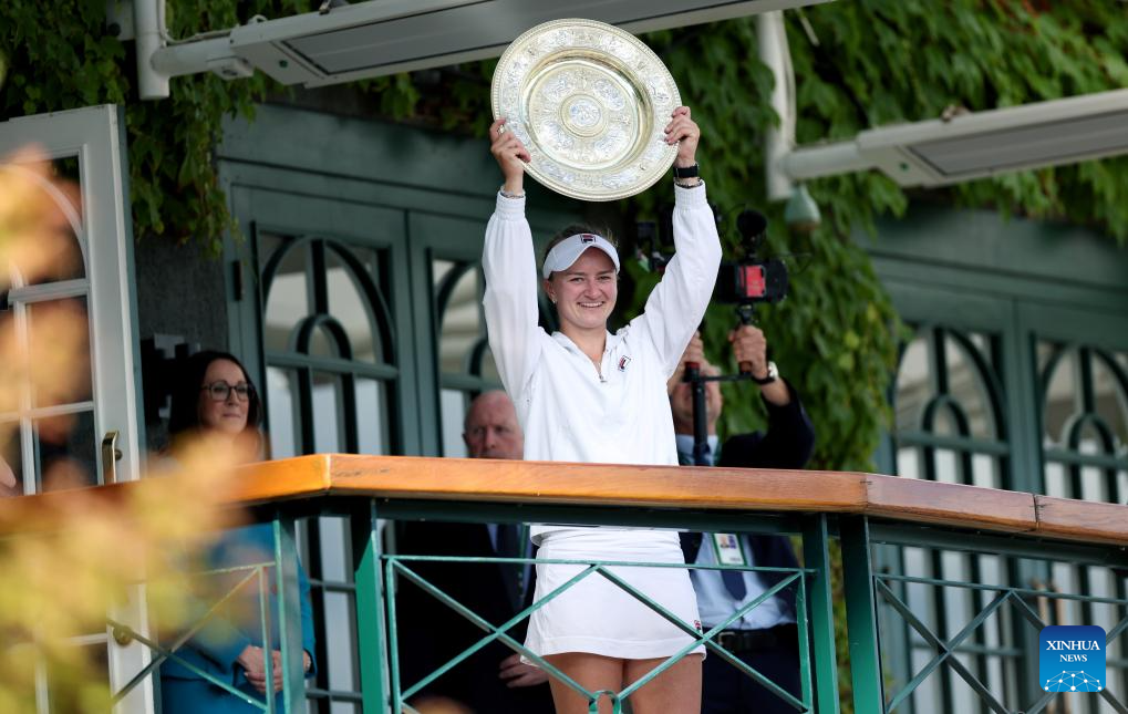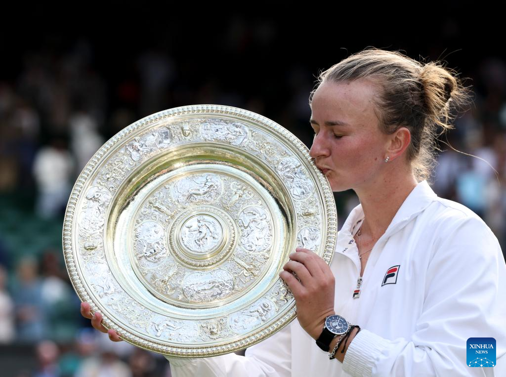 LONDRES, 14 julio, 2024 (Xinhua) -- Imagen del 13 de julio de 2024 de Barbora Krejcikova sosteniendo el trofeo después de ganar el partido de la final de individuales femeninos entre Barbora Krejcikova, de República Checa, y Jasmine Paolini, de Italia, en el Campeonato de Tenis de Wimbledon, en Londres, Reino Unido. (Xinhua/Li Ying)