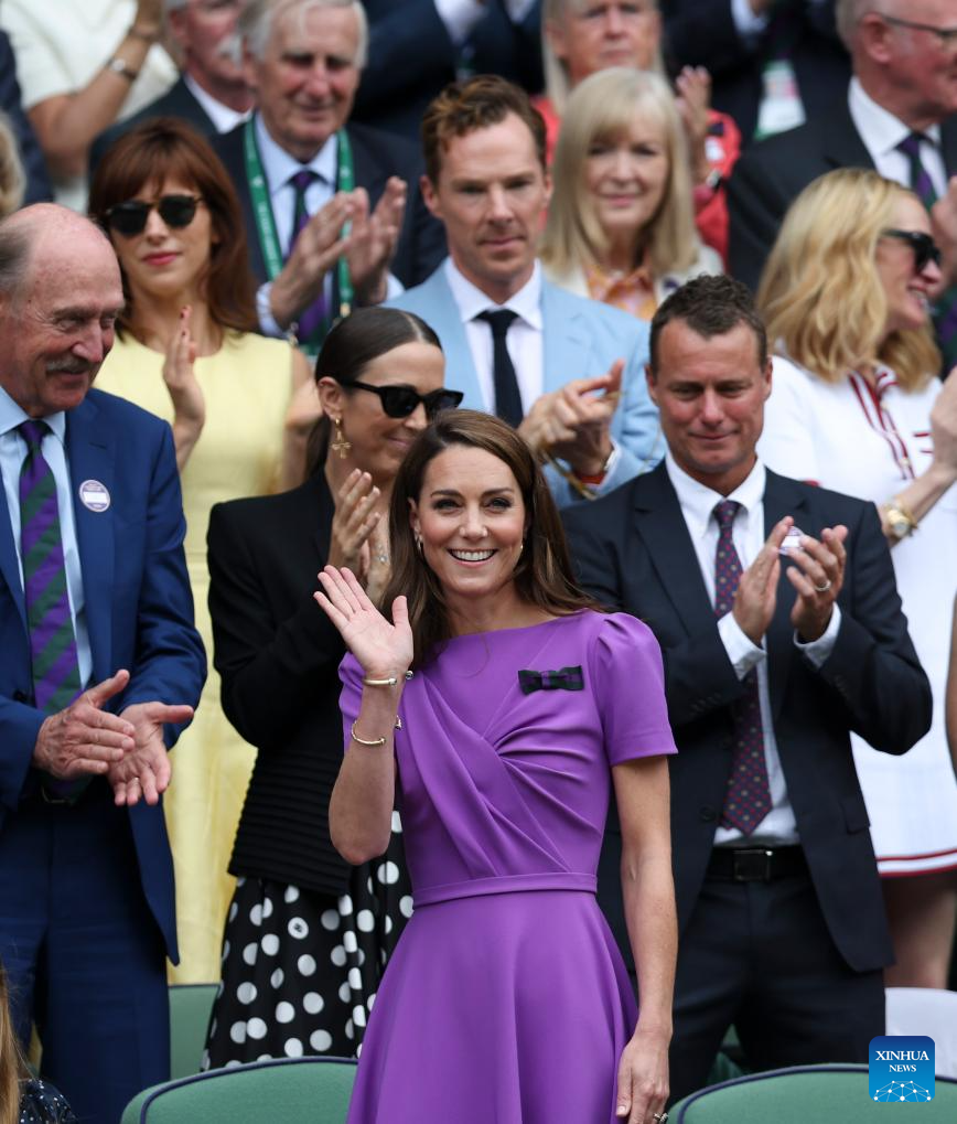 LONDRES, 14 julio, 2024 (Xinhua) -- La princesa de Gales, Catalina (frente) de Reino Unido, llega al palco real en la cancha central previo al partido de la final de individuales masculinos entre Carlos Alcaraz, de España, y Novak Djokovic, de Serbia, en el Campeonato de Tenis de Wimbledon, en Londres, Reino Unido, el 14 de julio de 2024. (Xinhua/Han Yan)