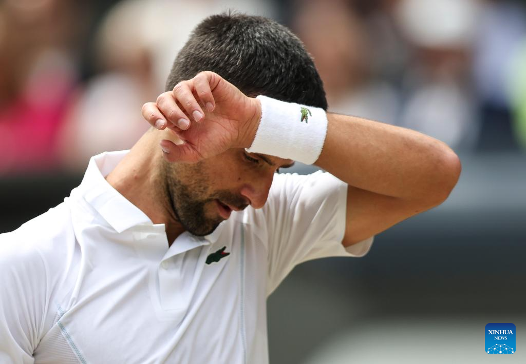 LONDRES, 14 julio, 2024 (Xinhua) -- Novak Djokovic reacciona durante el partido de la final de individuales masculinos entre Carlos Alcaraz, de España, y Novak Djokovic, de Serbia, en el Campeonato de Tenis de Wimbledon, en Londres, Reino Unido, el 14 de julio de 2024. (Xinhua/Han Yan)