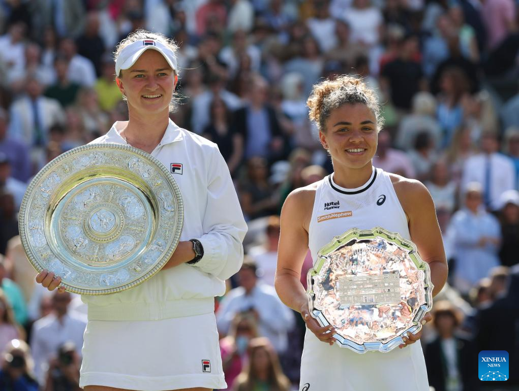 LONDRES, 14 julio, 2024 (Xinhua) -- Imagen del 13 de julio de 2024 de Barbora Krejcikova (i), y Jasmine Paolini, posando para una fotografía después del partido de la final de individuales femeninos entre Barbora Krejcikova, de República Checa, y Jasmine Paolini, de Italia, en el Campeonato de Tenis de Wimbledon, en Londres, Reino Unido. (Xinhua/Han Yan)