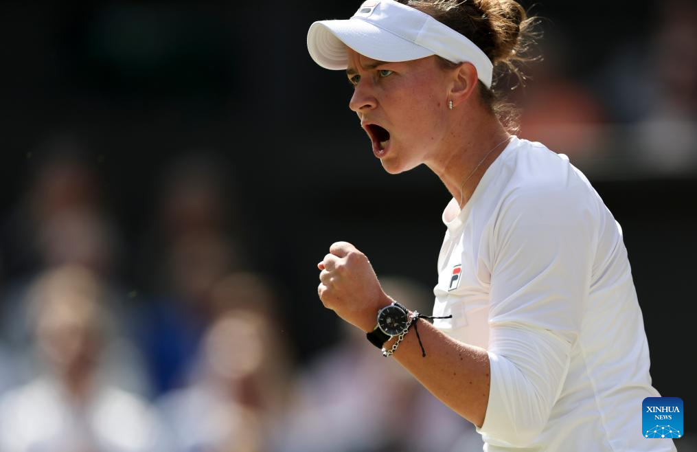 LONDRES, 14 julio, 2024 (Xinhua) -- Imagen del 13 de julio de 2024 de Barbora Krejcikova festejando un punto durante el partido de la final de individuales femeninos entre Barbora Krejcikova, de República Checa, y Jasmine Paolini, de Italia, en el Campeonato de Tenis de Wimbledon, en Londres, Reino Unido. (Xinhua/Han Yan)