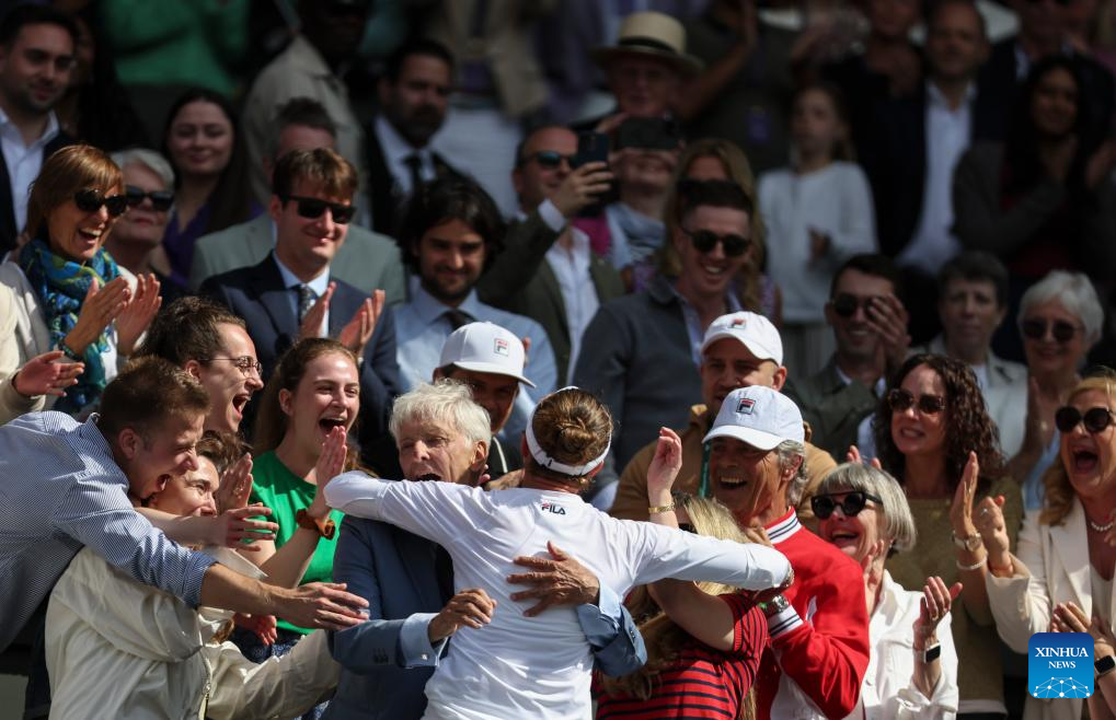 LONDRES, 14 julio, 2024 (Xinhua) -- Imagen del 13 de julio de 2024 de Barbora Krejcikova (c-abajo), festejando con su equipo, familia y amigos después de ganar el partido de la final de individuales femeninos entre Barbora Krejcikova, de República Checa, y Jasmine Paolini, de Italia, en el Campeonato de Tenis de Wimbledon, en Londres, Reino Unido. (Xinhua/Han Yan)