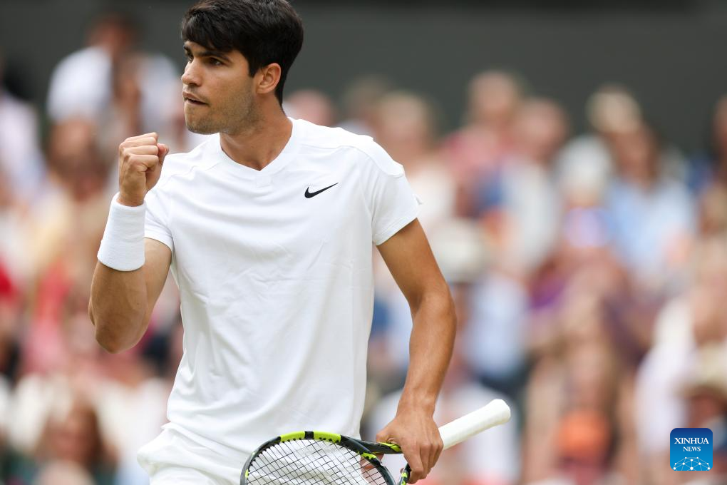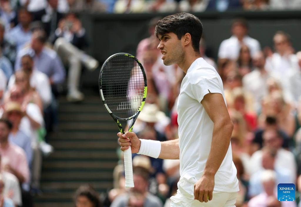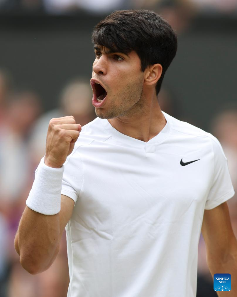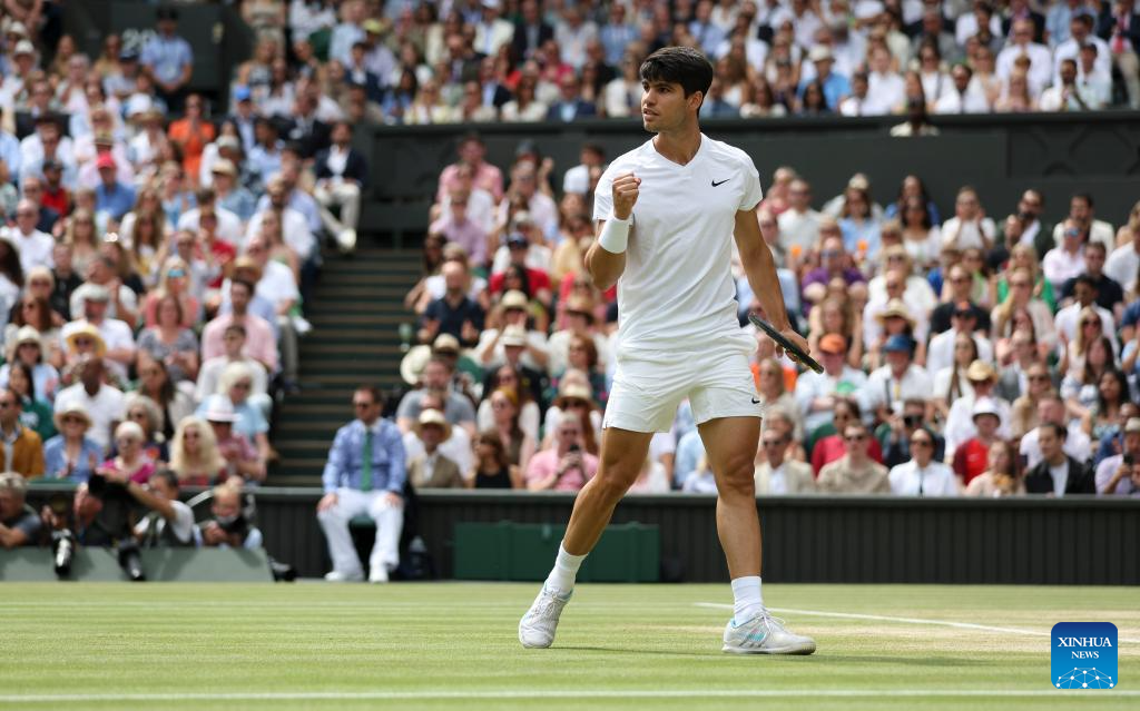 LONDRES, 14 julio, 2024 (Xinhua) -- Carlos Alcaraz festeja un punto durante el partido de la final de individuales masculinos entre Carlos Alcaraz, de España, y Novak Djokovic, de Serbia, en el Campeonato de Tenis de Wimbledon, en Londres, Reino Unido, el 14 de julio de 2024. (Xinhua/Han Yan)