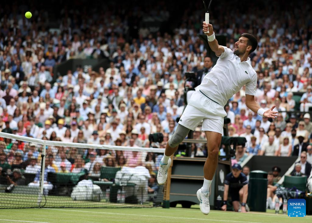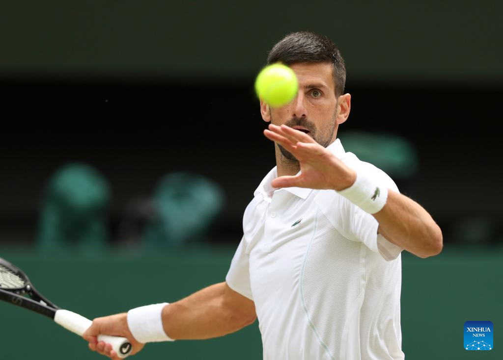 LONDRES, 14 julio, 2024 (Xinhua) -- Novak Djokovic devuelve la pelota durante el partido de la final de individuales masculinos entre Carlos Alcaraz, de España, y Novak Djokovic, de Serbia, en el Campeonato de Tenis de Wimbledon, en Londres, Reino Unido, el 14 de julio de 2024. (Xinhua/Han Yan)