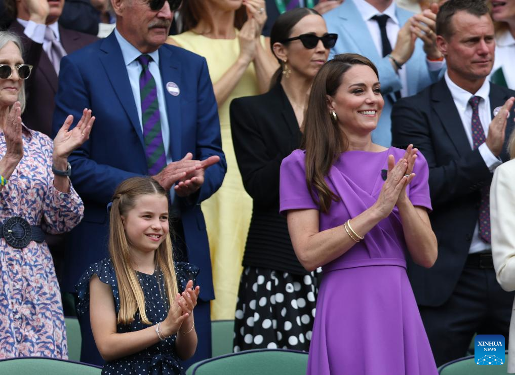 LONDRES, 14 julio, 2024 (Xinhua) -- La princesa de Gales, Catalina (d-frente) de Reino Unido, y la princesa Carlota (i-frente), aplauden cuando los jugadores llegan a la cancha central previo al partido de la final de individuales masculinos entre Carlos Alcaraz, de España, y Novak Djokovic, de Serbia, en el Campeonato de Tenis de Wimbledon, en Londres, Reino Unido, el 14 de julio de 2024. (Xinhua/Han Yan)