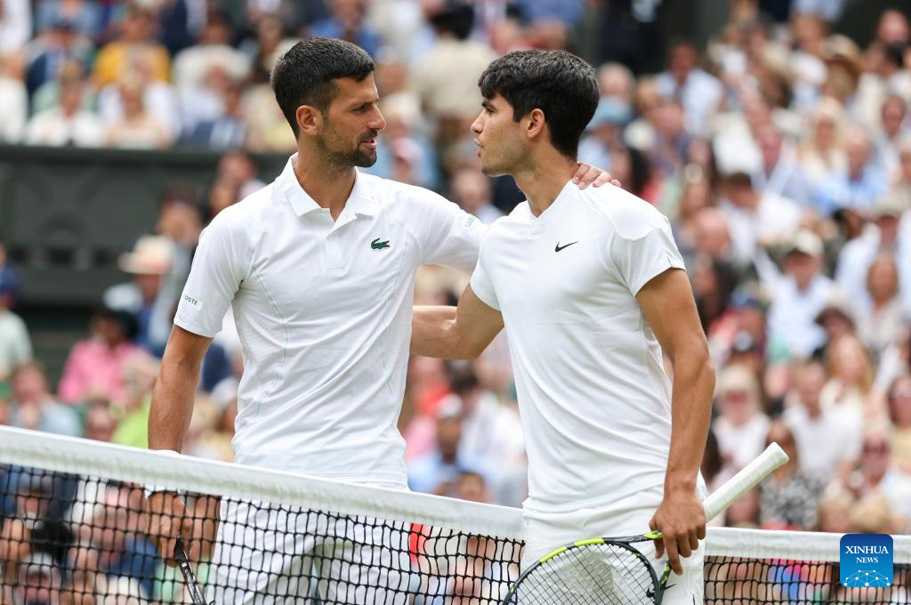 LONDRES, 14 julio, 2024 (Xinhua) -- Novak Djokovic (i) reacciona junto a Carlos Alcaraz previo al partido de la final de individuales masculinos entre Carlos Alcaraz, de España, y Novak Djokovic, de Serbia, en el Campeonato de Tenis de Wimbledon, en Londres, Reino Unido, el 14 de julio de 2024. (Xinhua/Han Yan)