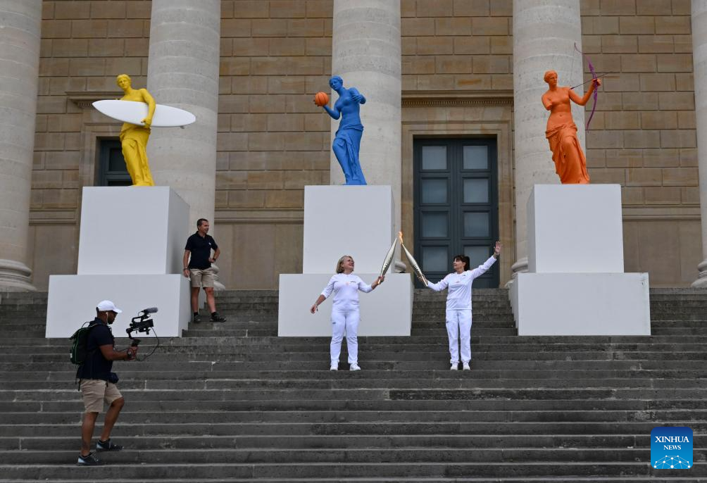 PARÍS, 14 julio, 2024 (Xinhua) -- La portadora de la antorcha, Valerie Frehaut (d), pasa la llama olímpica a Virginie Babinet, durante el Relevo de la Antorcha de los Juegos Olímpicos de París 2024, en París, Francia, el 14 de julio de 2024. (Xinhua/He Changshan)
