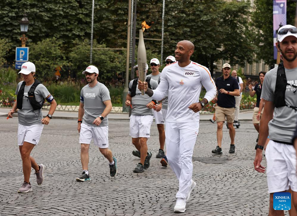 PARÍS, 14 julio, 2024 (Xinhua) -- El director técnico francés, Thierry Henry, de la selección nacional de fútbol de Francia para los Juegos Olímpicos de 2024, sostiene la antorcha olímpica durante el Relevo de la Antorcha de los Juegos Olímpicos de París 2024, en París, Francia, el 14 de julio de 2024. (Xinhua/Gao Jing)