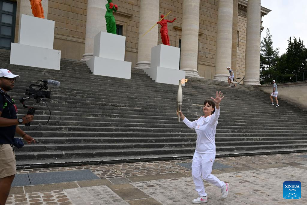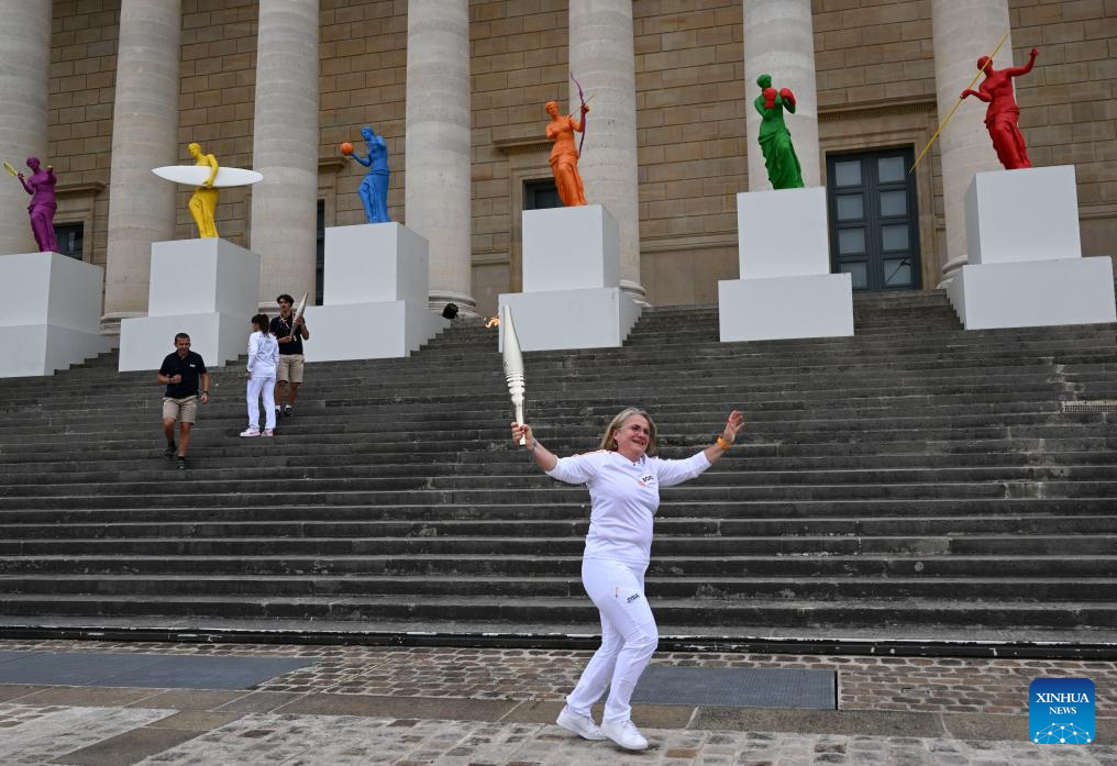 PARÍS, 14 julio, 2024 (Xinhua) -- La portadora de la antorcha, Valerie Frehaut, sostiene la antorcha olímpica durante el Relevo de la Antorcha de los Juegos Olímpicos de París 2024, en París, Francia, el 14 de julio de 2024. (Xinhua/He Changshan)